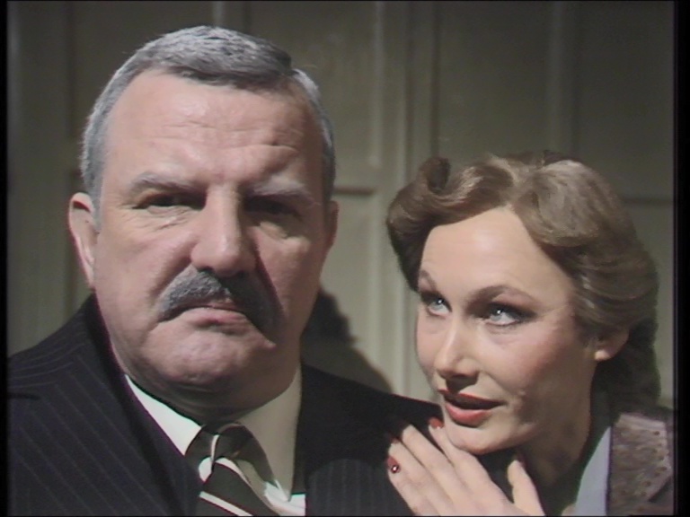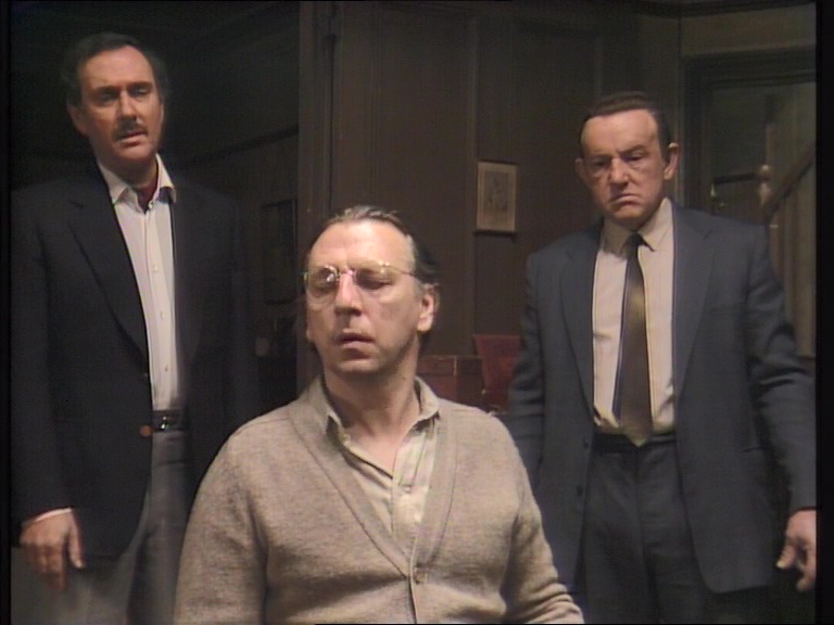 Up first on disc one is Tea Party (1965, 76m14s), adapted from an early Pinter play and aired as part of the program Largest Theatre in the World. The comic but ultimately surreal piece begins with a sanitation company CEO Disson (Leo McKern) interviewing a potential personal assistant, Wendy (Viven Merchant, Pinter's wife at the time), only to find her presence to be the catalyst that could threaten his recent marriage to Diana (Jennifer Wright) and even his own sanity and physical health. Directed by Charles Jarrott (Anne of the Thousand Days, The Other Side of Midnight), this earliest of the surviving Pinter productions exists as a black-and-white kinescope and stills entertains with a snappy script and a great cast of supporting players including John Le Mesurier and the great Charles Gray (The Devil Rides Out), who steals every single second he has on screen as McKern's new brother-in-law. Then The Basement (1967, 54m38s), from Theatre 625 and also directed by Jarrott, features Pinter himself opposite Derek Godfrey and Kika Markham in a borderline abstract study about two men vying for control