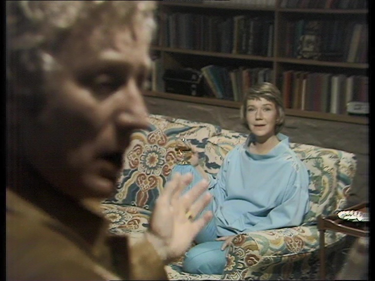 Directed by Christopher Morahan, Monologue (1973, 20m10s) on disc three is a one-man show with a nameless man (Henry Woolf) sitting in an empty room as dawn approaches and unloading his memories and deepest feelings to an empty chair. Old Times (1975, 75m10s), also directed by Morahan, is a three-character chamber piece (adapted from Pinter's Tony-nominated Broadway play) with married couple Deeley (Barry Foster, Frenzy) and Kate (Anna Cropper) hosting an evening at home with her onetime best friend, Kate (Mary Miller), for a cocktail-heavy walk down memory lane that doesn't seem to be quite the same path for everyone. An eerie and highly ambiguous work, this is the first of several English-language TV versions (with a handful of foreign-language ones as well) that comes very close to qualifying as a horror film. Landscape (1983, 45m1s), a onetime radio drama and play from the late '60s, take a similar look at a married couple (Colin Blakely and Dorothy Tutin) who sit in their austere kitchen and speak dramatically about their own opinions and memories without actually communicating with each other at all. Also included as a special feature, "Pinter People" (1969) is comprised of four Gerald Potterton animated shorts -- "Trouble in the Works"