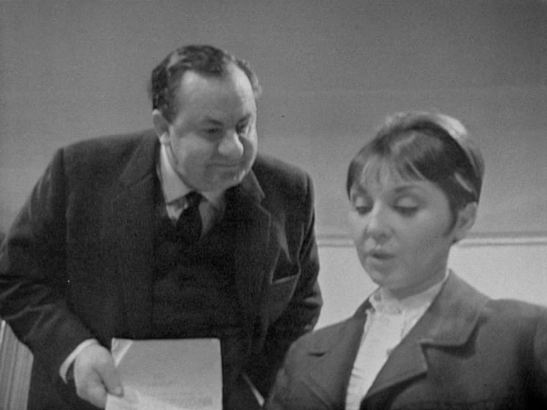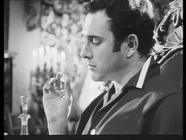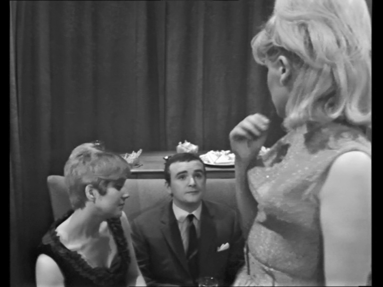 On to disc two, A Slight Ache (1965, 57m42s) features Maurice Denham and Hazel Hughes as an aging couple whose afternoon at home is plagued by a pesky wasp and then a seemingly homeless, mute match seller (Gordon Richardson) whose presence ignites insecurities and paranoia that may or may not be justified. This one also goes into uncanny and possibly supernatural territory, especially the very unsettling finale. Male insecurity also figures prominently in A Night Out (1967, 59m46s), with Tony Selby as a submissive mama's boy named Albert who decides to head out for an evening with some coworkers -- only to be accused of conduct very much unlike his apparent persona. In the aftermath of the evening, he goes on to meet a young woman who will put his true personality to the test. Previously presented in 1960 as an installment of Armchair Theatre (with Merchant), this is one of Pinter's more famous and controversial early