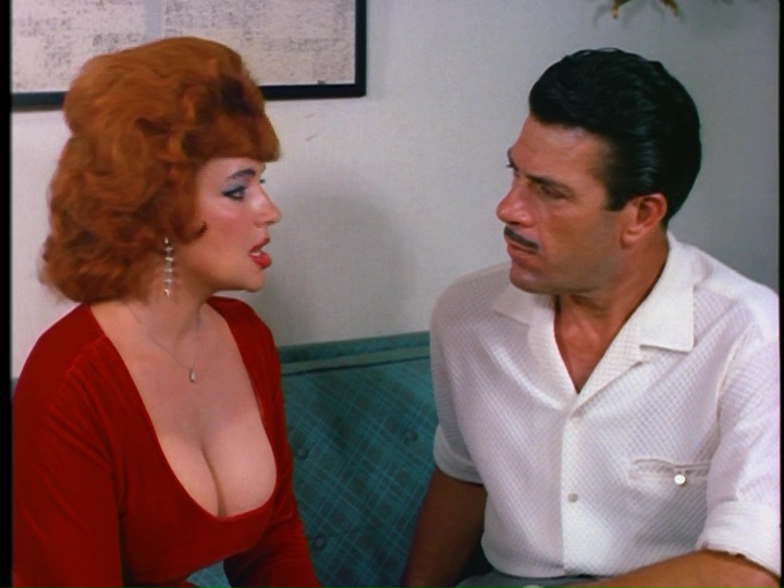 DVD back in the day, 1962's Blaze Starr Goes Nudist, an adorably ridiculous vehicle for famous burlesque performer Blaze Starr (whose life was later turned into the Hollywood film Blaze with Paul Newman and Lolita Davidovich). Here our gal Blaze is burned out by the endless grind of performing, autograph sessions, and photo shoots engineered by her manager and boyfriend, Tony (Berk), who has her under the studio lights every day by the crack of dawn. Trotting out for an afternoon off under the palm trees, she wanders into a movie theater where she sees a spotlight feature on nearby nature camp Sunny Palms Lodge. More than a little intrigued, she slips on some gold lamé pants and drives out to the resort where she's greeted by manager Andy (played by crooner Ralph Young, who sang most of Doris' '60s theme songs). As it turns out, the lifestyle is just the tonic she needed -- but Tony's not pleased at the bad publicity that might emerge from, uh, a stripper being a member of a nudist colony. Will Blaze ever find a perfect work-life balance, and how much clothing will she have to wear in the process?