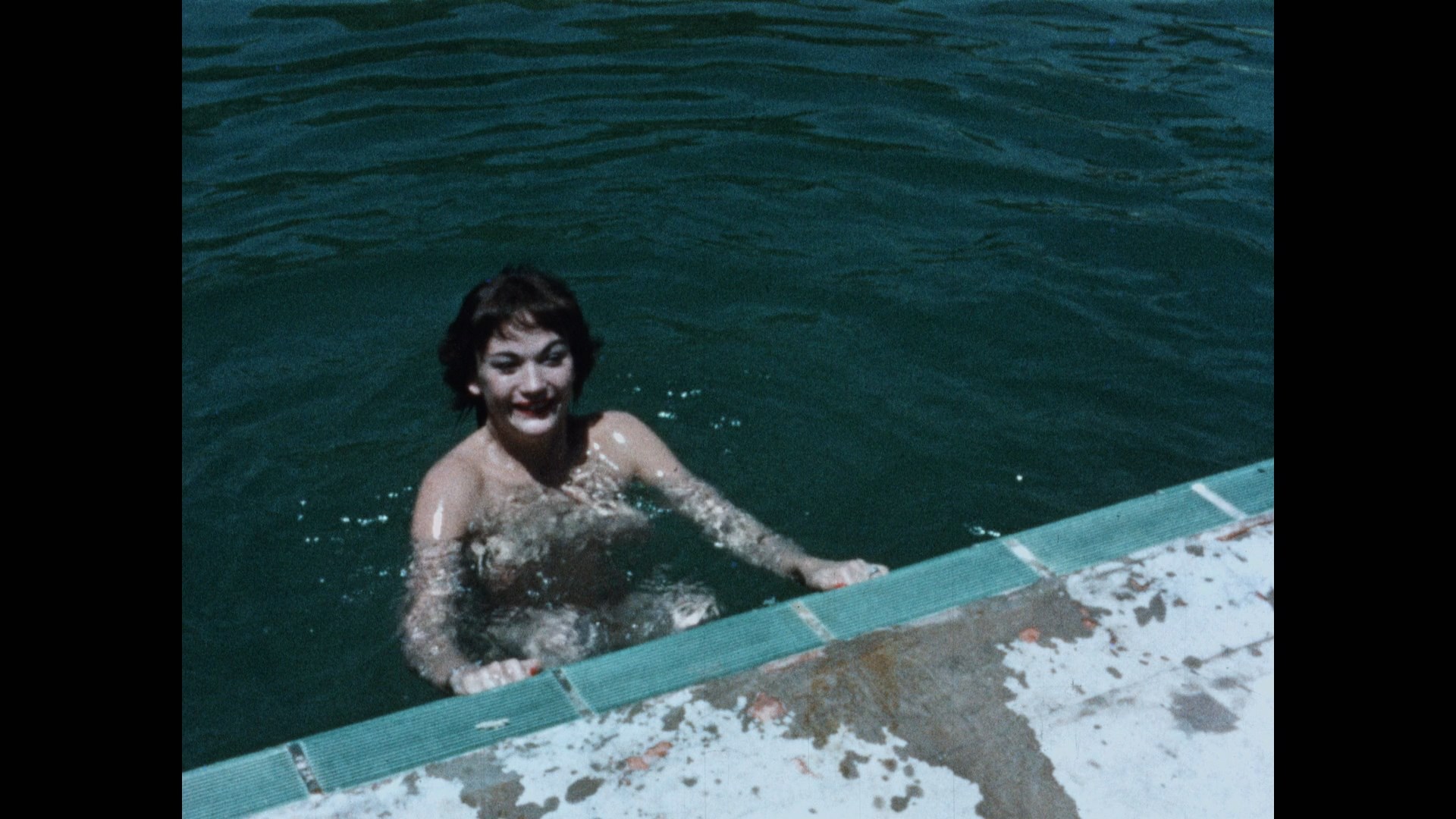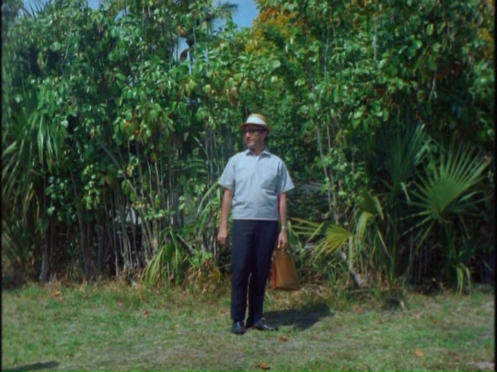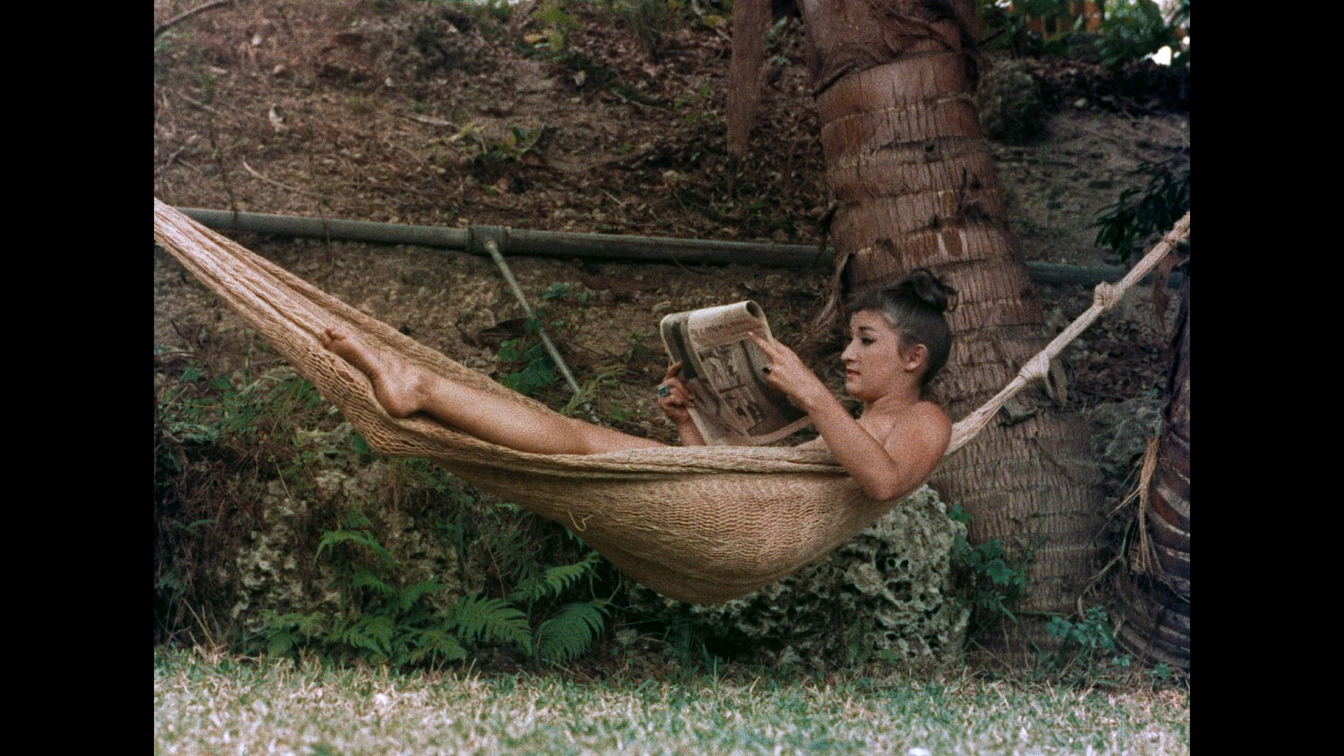 close to the camera. As mentioned above, this film only exists as a German print featuring only a dubbed dialogue track. Fortunately a text copy of all the dialogue surviving courtesy of the film's submission to the New York censorship board; that made it possible to create a new English track for the 2017 Pop Cinema DVD, which isn't all that jarring since Wishman usually had canned, disembodied voices in her films anyway. It's all set to a bouncy, pseudo-Herb Alpert score that works well enough, too. The image quality isn't so hot, looking washed out and dull, and it seems to be from an unconverted PAL source clocking in at a mere 52 mins 41 secs. Also included is an audio commentary with Michael Rasso, John Fedele, and Bowen covering the director's background ("a national treasure!"), the scenes shot inside her apartment, the status of female directors at the time, and the shooting locations (with stock Florida shots from the real Sunny Palms turning among among the main New Jersey locales). Other extras include a brief Atomic TV segment with Wishman (4m24s) and Bowen, a "Nature Girl" nudist short (13m43s) from the legendary Dan Sonney, a "Nudism" educational short (10m53s) with lots of peek-a-boo shots and scientific text inserts, a 1941 "Rock Lodge" short (14m37s) from the National Convention of American Sunbathers Association in New Jersey (interestingly the earliest piece but also the only one with outright frontal nudity), and a trailer for Hideout in the Sun.