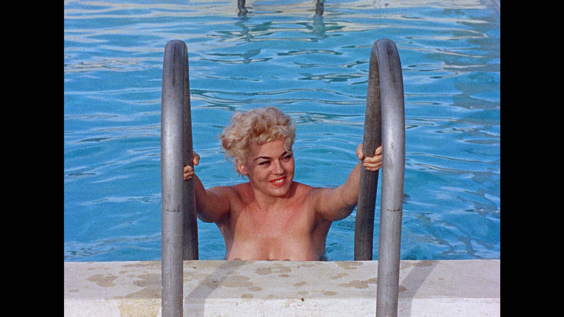 toss-up either way depending on own preference. Michael J. Bowen (now the official owner of the film) contributes a full audio commentary in which he talks in detail about Doris' career and the bizarre history of this film, and he also provides liner notes and a text interview with Doris going more into detail about her nudist camp cinematic cycle. The first disc also contains a 6m49s Wishman interview (excerpted from Schlock! The Secret History of American Movies), a 1960 "The Year That Was" newsreel, and a batch of Retro-Seduction trailers, while the second disc adds on a bonus nudie featurette ("Postcards from a Nudist Camp," basically a vintage European travelogue short) and additional vintage trailers for titles like Daddy Darling. The 2022 Blu-ray comes from the same print, obviously, but it hasn't been given any digital tampering here (i.e., original credits left intact) and looks a bit sharper here. The color palette is also more neutral by comparison to more saturated, warmer look of the DVD. A new, different Bowen track is also included with a slew of additional info that wasn't available at the time as well as thoughts about the quirks of this outing shot around Dade County.