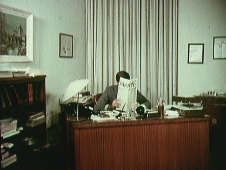 lost, Playgirls International and Behind the Nudist Curtain, and this one was thought lost as well until a single German-language print popped up. In a fictitious seaside kingdom, a rich prince (Niles) lives in a castle (that looks more like a plantation) but believes he should be employed in case the peasants revolt. To achieve his goal, he slips out five days a week to go get a job in the city at a business office where he... doesn't do much, apparently. On the weekend he takes off to Sunny Palms Lodge, a pretty ragged-looking resort for the "avid sun enthusiast" where everyone swims and plays volleyball and archery all day. Meanwhile two twins starting new jobs at the office, blonde Eve and brunette Sue Pringle (Sinclair), have gotten to crash for a year in the apartment of traveling friend Mary, with Eve catching the prince's eye as his lazy secretary. A chance weekend meeting at Sunny Palms between Eve and "Mr. Prince" (the only attendee who insists on wearing shorts at all times) sends them strolling through lots of outtakes from Doris's previous films and scintillating shots of naked people seesawing and feeding ducks. When Eve gets back home, Sue wonders whether blondes really have more fun -- and since she has a crush on the prince, she decides to do a hair color switcheroo to nab the man she wants.