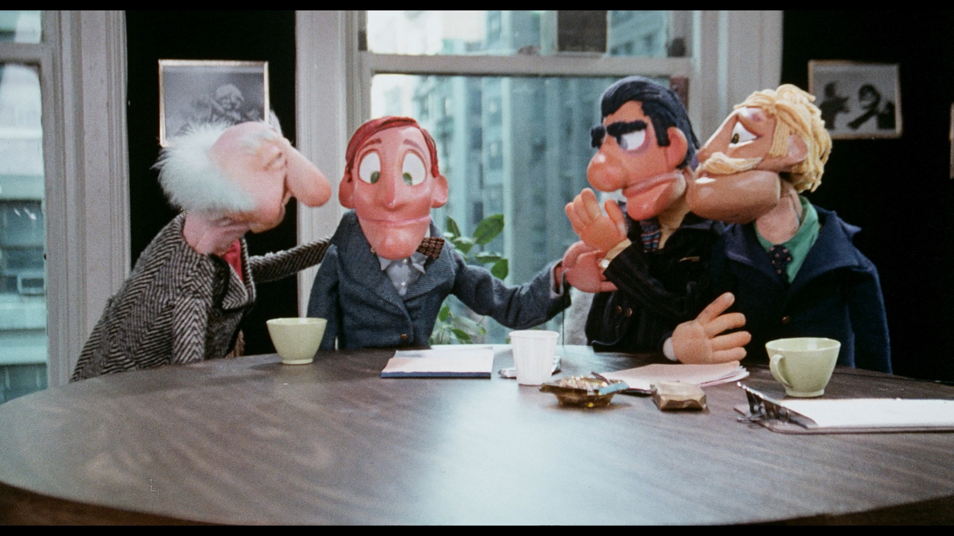 A pretty tough sell to the raincoat or midnight crowds, Let My Puppets Come has flown under the radar on home video for the most part with only a sorry, heavily edited DVD from Caballero offering much relief to curiosity seekers. Fortunately Vinegar Syndrome salvaged it with a dual-format Blu-ray and DVD edition that doesn't specify the film element source but looks much, much, much better, even with some bumpy reel change points and little bits of damage here and there. The DTS-HD MA English mono track is also much clearer and does what it can with the songs, which are pretty basic and won't give your sound system much of a workout. English SDH subtitles are also included. On the commentary side, Heather Drain and Samm Deighan return to Damiano territory afterSkin Flicks and dive right in for a breakdown of the director's whimsical side, the background behind the puppetry, the various celebrity send ups, speculation about the possible inspirations for the some of the character designs, and the occasional human actors like the hilarious Penny Nicholls. Another audio option is a phone conversation between puppeteer and puppet designer James Racioppi and Casey Scott who have fun casually chatting about Damiano, Kumquats (which sort of spawned this film in an indirect way), his professional background, his brushes with other landmark puppeteers, and tons more. Between the two tracks it's a massive, very welcome scholarly record of a film that could have easily be consigned to oblivion. If that weren't enough, you also get coverage about Kumquats itself courtesy of a separate audio conversation by Scott with Nicolas Coppola (41m58s) about his own role directing the production and the history of its participants and performance evolution (about which he has very mixed thoughts); that's followed by audio of a production of Kumquats itself (9m31s), which pretty sounds like a bawdy drag show in this context. The theatrical trailer is also included and should find its way into party highlight reels for years to come.
