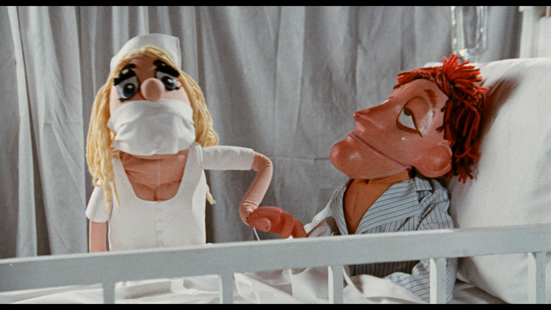 More of an extended batch of skits than a traditional narrative, this parade of puppet perversions boasts synthetic stars with names like "Robert Redfoot," "Clark Gobble," "Anthony Quimm," "Clitoris Leachman," "Agnes More-head," and "Connie Lingus." The framing device revolves around plans by desperate Ned, Fred and Red to mount a porno movie to pay off their mob debt. From there it's a string of scenarios both real and imagined involving sexy nurses, (literal) doggie sex, a variation on Pinocchio, and commercial spoofs including Screw's Al Goldstein plugging "Lusterine." Damiano himself even pops up at the beginning interacting with a puppet hot dog vendor and seems to be having fun, right around the same time he was developing this film's intended co-feature, The Story of Joanna, as a full-fledged kinky feature of its own. On top of that you get a pretty blatant homage to Madame, an appearance by Luis "Ralphus" de Jesus the same year as Bloodsucking Freaks, and the screen debut of Jonathan Freeman, future voice of Jafar in Aladdin and a regular Disney voice performer, who pops up as a chauffeur in one extended musical comedy bit.