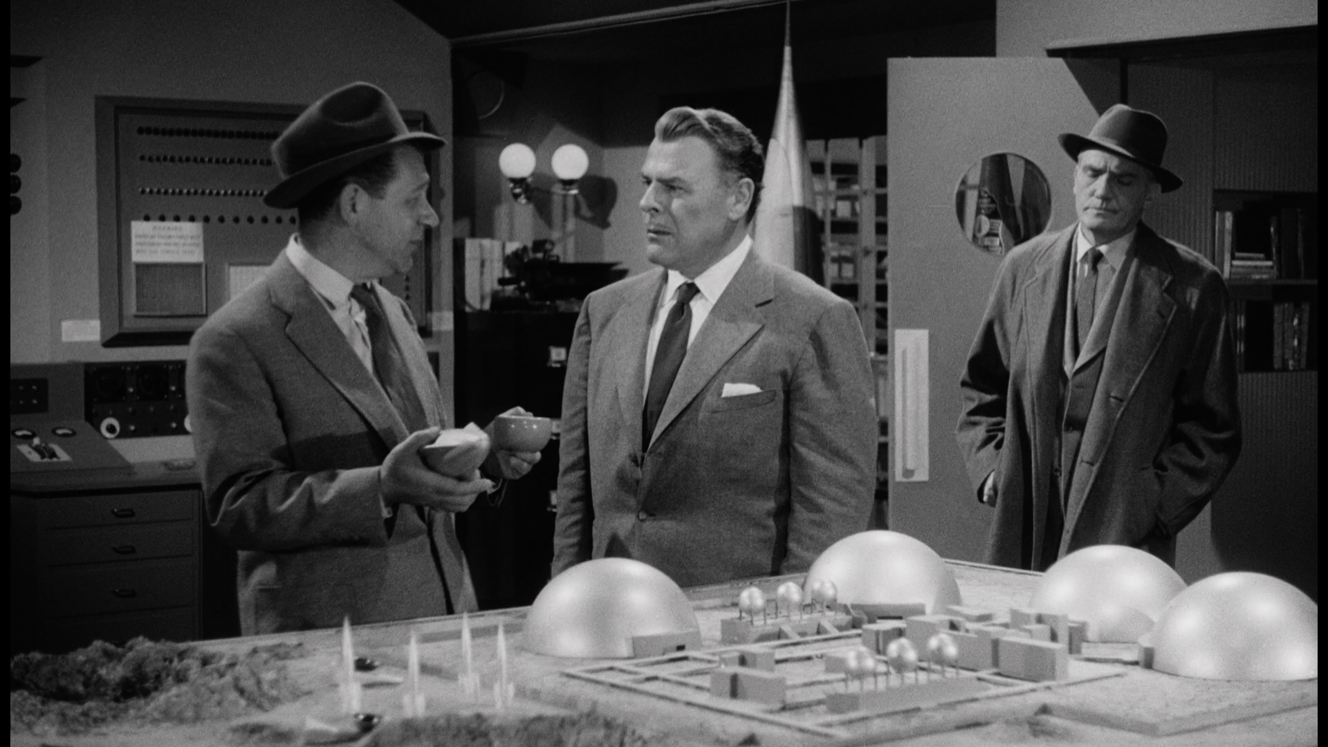 Disgruntled by the British government's refusal to back his plans for moon colonization, Professor Bernard Quatermass (film noir regular Donlevy) is nearly hit while driving along a country road. The other driver was apparently wounded by a meteorite-like object from the sky. Upon returning to his lab, Quatermass is informed of a series of strange formations falling from the sky towards the nearby Winnerden Flats. Accompanied by one of his assistants, Quatermass drives out to the site and discovers a facility similar to his own moon colony designs. However, Quatermass is apprehended by mysterious security guards and escorted to a government created housing project. Upon further study, however, the tenacious scientist discovers that perhaps the eerie dome structure houses alien forces whose intentions are quite sinister indeed.
