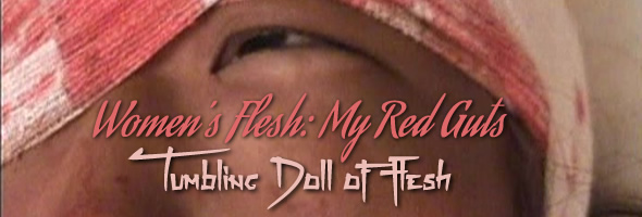 Plotless and harrowing, Women's Flesh: My Red Guts charts the descent into madness of a pigtailed housewife who, according to the synopsis, has just been abandoned by her husband. (A fair guess, though the film doesn't exactly go into deep psychological detail.) Desperate to feel something, she tends to sit on the edge of the bathtub and subject her more delicate bodily areas to a variety of a intruding objects (some shown with just enough pixilation to still give you the idea, and be kind of glad that this self-imposed censorship still existed in Japan at the time once you see fake blood spattering in a bathtub). When she isn't getting progressively masochistic, we get to see her munching on food (with an abrasive fluttering noise on the soundtrack) and licking kitchen utensils. Then the title starts to come into play, and your gag reflex will get a serious workout.
