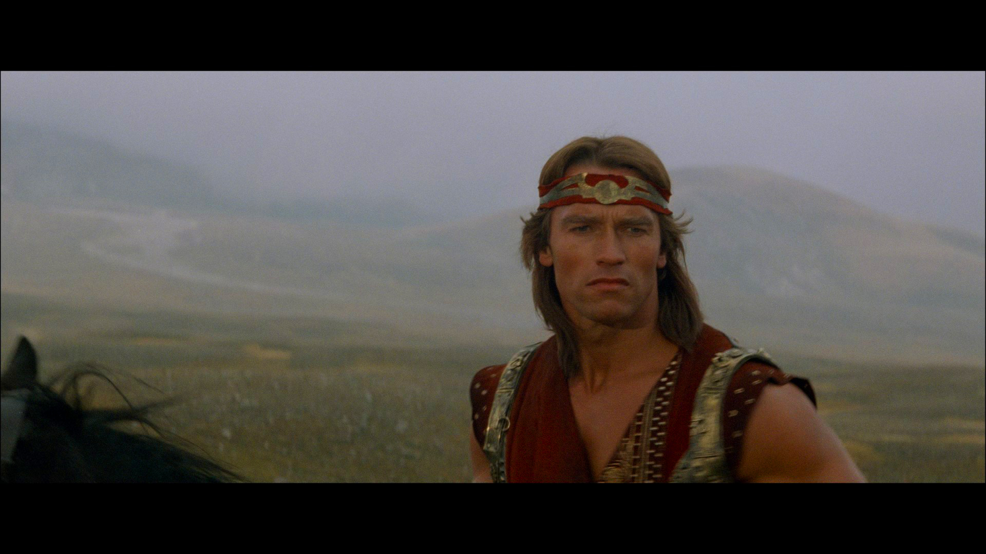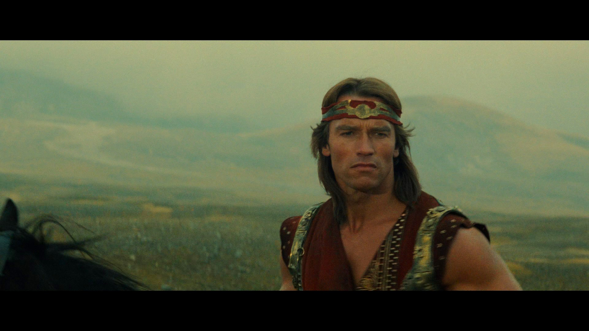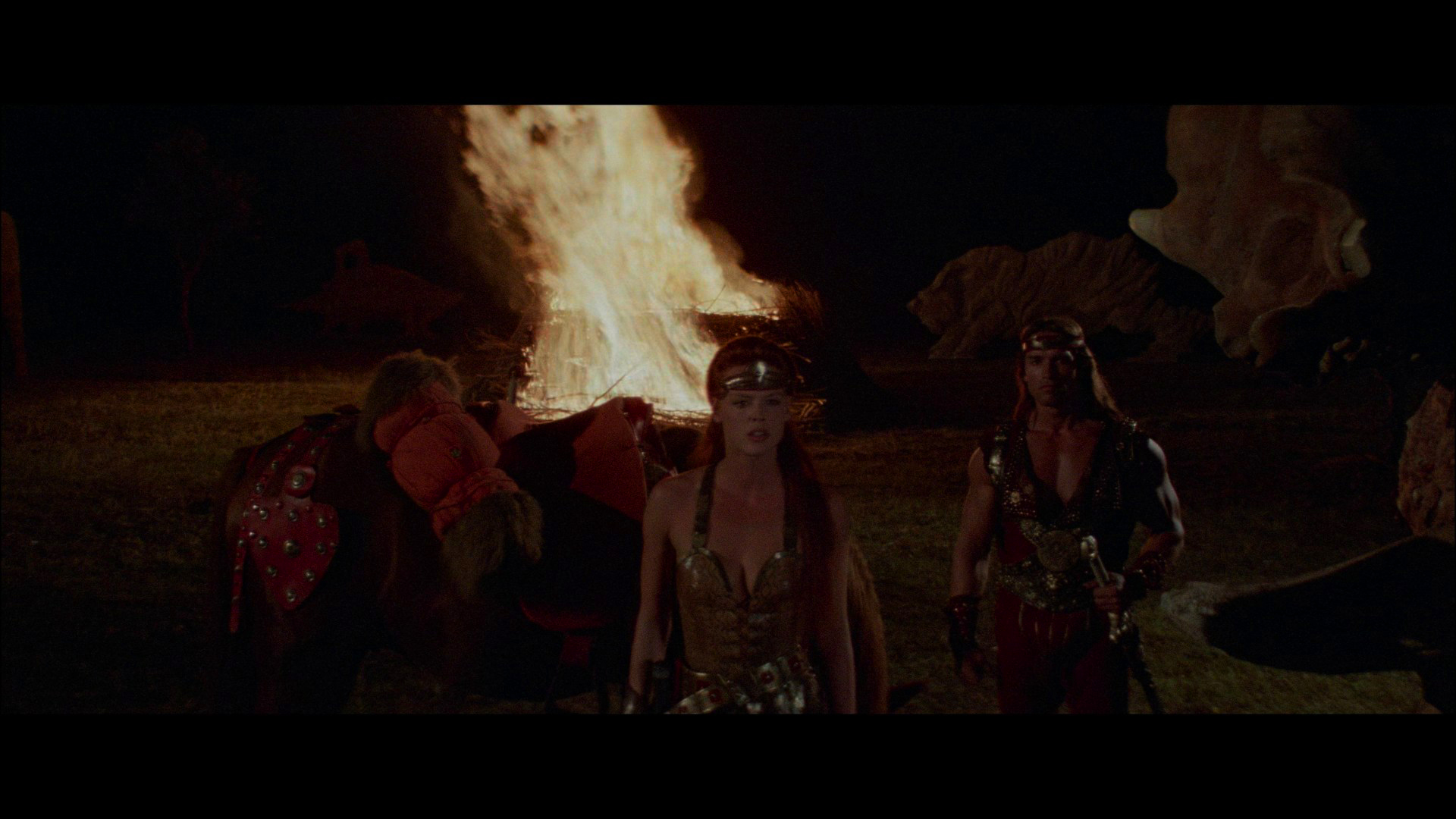 time and has been on home video numerous times including an okay Warner DVD in 2004. Pretty much everywhere else in the world, the film is controlled by StudioCanal (or whichever spelling of the company's name you prefer) who first issued it on Blu-ray in 2010 via its own name and affiliates (eventually folded into the main company) Optimum in the U.K. and Kinowelt in Germany. That release looked pretty good at the time and came with English and French 5.1 DTS-HD audio options plus German, Italian, Spanish, or Russian 2.0 mono, with Dutch, French, German, Italian, Spanish, Turkish, Danish, Norwegian, Swedish, Finnish, or Russian subtitles. The film was mixed and released theatrically in mono for some reason, but the 5.1 remix sounds okay even if Morricone's rather thin-sounding score doesn't particularly lend itself to having lots of reverb added on. Also featured on the disc are a trailer and "Arnold Schwarzenegger: The Man Who Raised Hollywood" (15m39s), an okay featurette on Schwarzenegger’s early career with colleagues like Peter Hyams, Arthur Allan Seidelman, Edward Pressman, Michel Ferry (an assistant director on Red Sonja), and others chatting about the star's career from Pumping Iron onward. Then Ferry turns up solo for "Red Sonja vs. Kalidor: The making of a Misunderstanding" (12m3s) an archive interview with assistant director Michel Ferry about De Laurentiis' technical prep for the film and the complications of making a Conan film where you couldn't use the character's name.