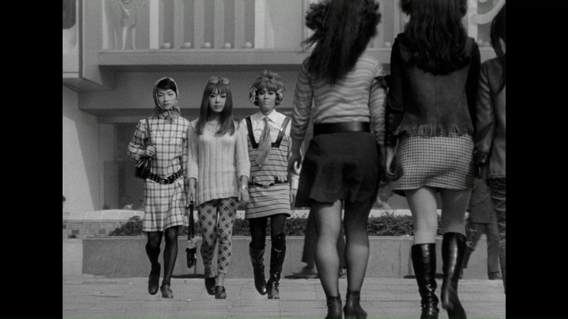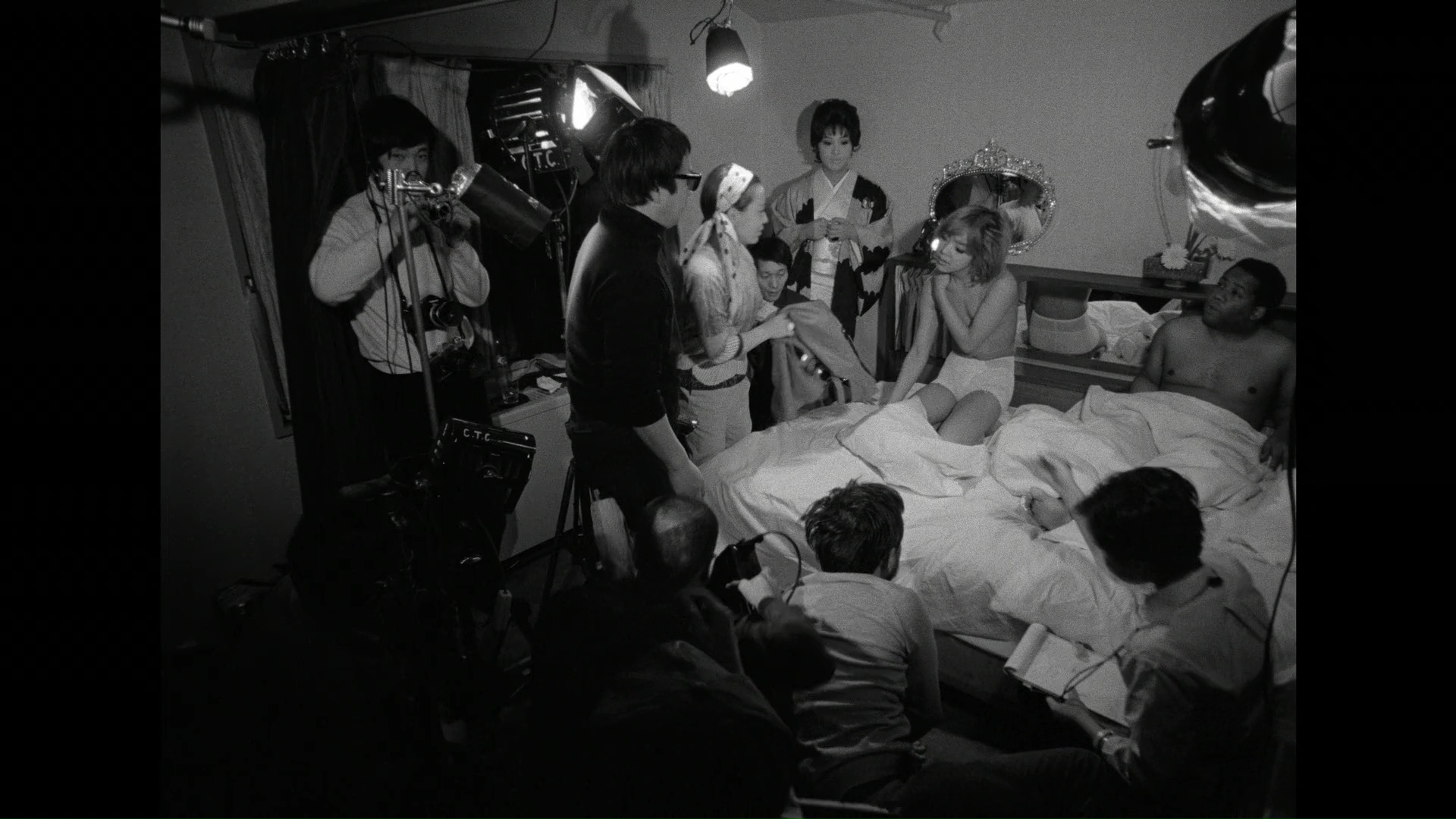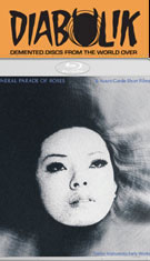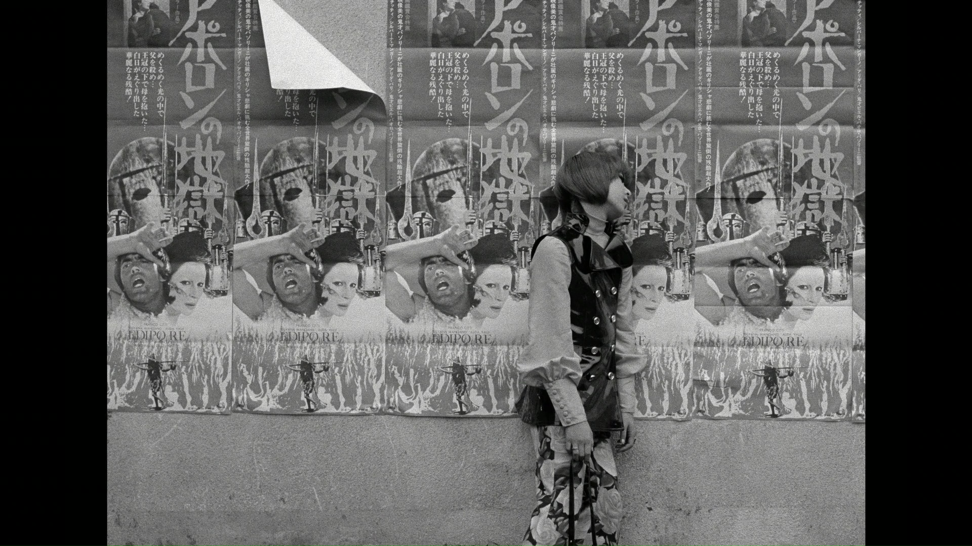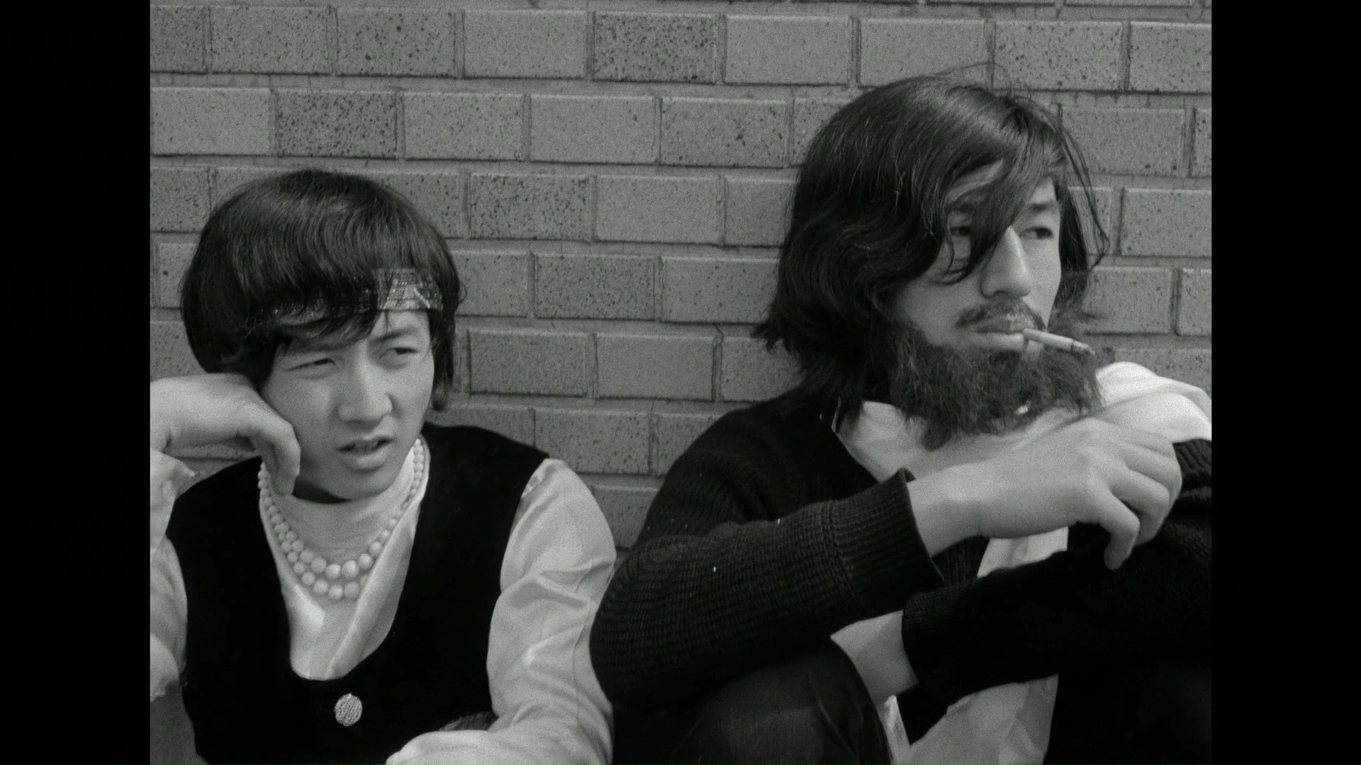 deliberately stylized sequences. The DTS-HD MA Japanese mono soundtrack is also in excellent condition, with optional English subtitles. Film programmer and Japanese cinema expert Chris D. offers a thorough audio commentary including deep reads of the film's symbolism and visual motifs as well as the film's aesthetic ties to the avant garde and the Japanese new wave, including its pop culture elements with real-life figures popping up as themselves (from some famous faces to the non-actor "gay boy" interview subjects). Also included on the first Blu-ray with the feature are the original Japanese trailer and the impeccably edited, striking 2017 trailer for America. A second Blu-ray features a selection of eight Mutsomoto experimental shorts: "Nishijin" (1961, 25 mins.), "The Song of Stone" (1963, 24 mins.), "Ecstasis" (1969, 11 mins.), "Metastasis" (1971, 8 mins.), "Expansion" (1972, 14 mins.), "Mona Lisa" (1973, 3 mins.), "Siko Soku Ze Ku" (1975, 8 mins.), and "Atman" (1975, 11 mins.). All are impossible to synopsize, of course, but the themes run from a monochrome study of developing civilization and nature to eye-popping psychedelic experimentation. In the context of the main film, "Ecstasis" is the most relevant as slivers of it would wind up being used in the feature. The packaging features a liner notes booklet with an extensive essay by Hirofumi Sakamoto, Director of the Postwar Japan Moving Image Archive, with Hiroshi Eguchi and Koji Kawasaki, charting Matsumoto's iconoclastic career in Japan and notes on all of the short films contained here.