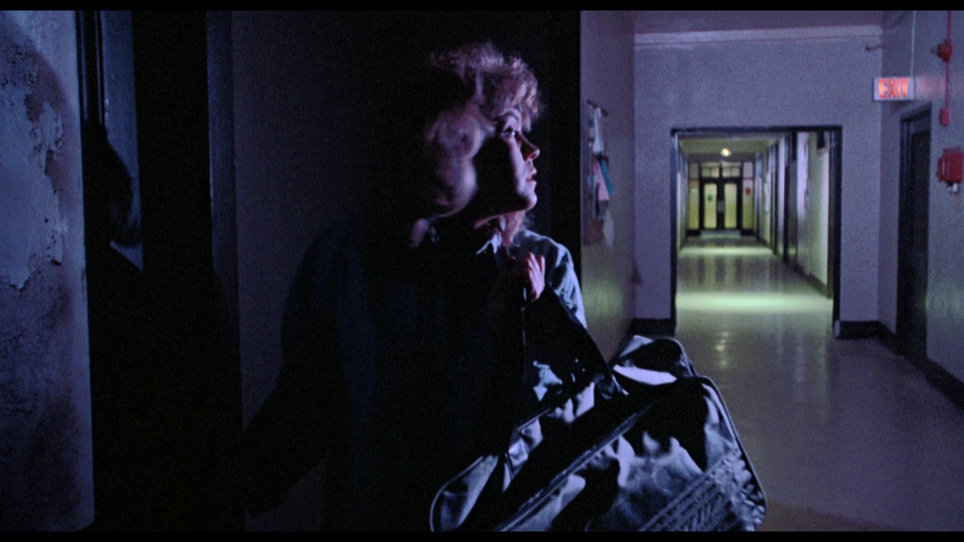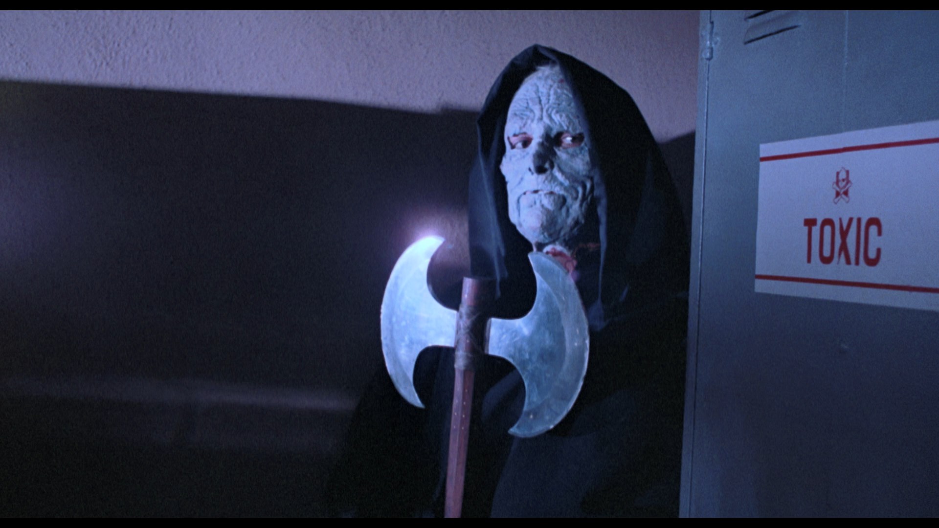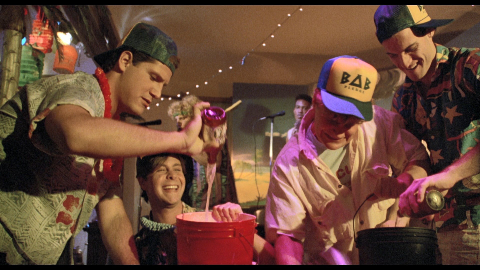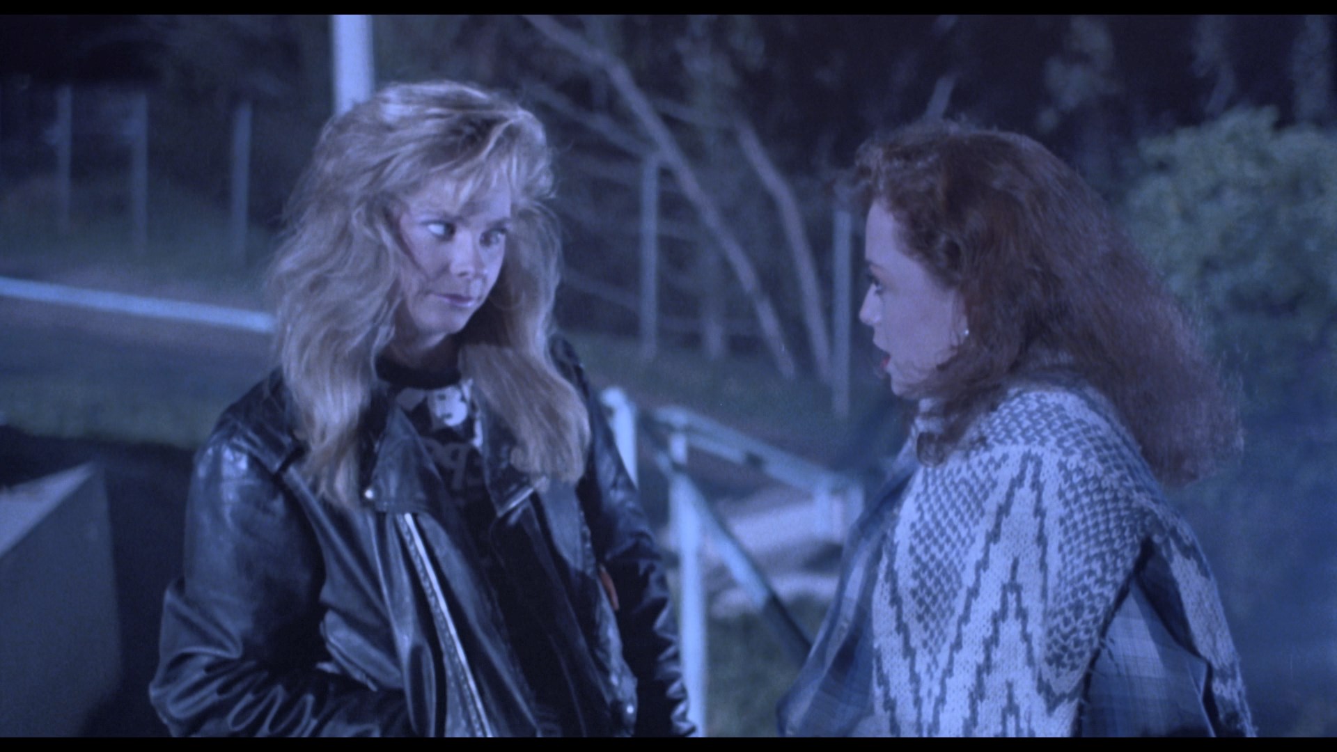 from a dated open matte video master that looked okay but unspectacular at the time with some slight image squeezing in evidence. In 20201, Vinegar Syndrome brought the film to Blu-ray (continuing its run of frat horrors after Pledge Night) featuring a new 2K scan and restoration from the 35mm interpositive (with the film somehow ending owned now by MGM under the umbrella of Orion). The Blu-ray looks significantly better with the scan bringing out detail and texture that was absent before, including natural film grain that retains the original gritty and sometimes rough appearance of the original film. Colors are bright and really pop at times, and any owners of the DVD should find this to be a significant upgrade. The restoration of the original matted compositions helps as well, bringing focus to a number of shots that seemed out of whack before. The DTS-HD MA 2.0 English track (with optional English SDH subtitles) sounds fine for the source, retaining the original Ultra Stereo mix which is essentially mono for the majority of the running time with some moderate channel separation turning up mainly during the music performances. The foursome from the long-running slasher movie podcast The Hysteria Continues! provide another fun audio commentary here chatting about campus slashers, late '80s horror, the comparative lack of gore, the sometimes puzzling home video release history, and much more. A new interview with actress Courtney Gebhart, "So 80's" (12m52s), is very upbeat and enthusiastic as she chats about her glee at getting to sing in the film, her early days as an actress, the process of shooting on 35mm on a low budget at the time, and her memories of her fellow actors as well as her director, veteran stunt man Bob Bralver. Then "Still Dean Hamilton" (12m58s) features the lead actor explaining how he came from Canada to L.A. and got started in soaps before plunging into this film, which was shot in a variety of locations around West Los Angeles (including a veterinary hospital) and allowed him and the rest of the cast to have a lot of fun during their party scenes.
