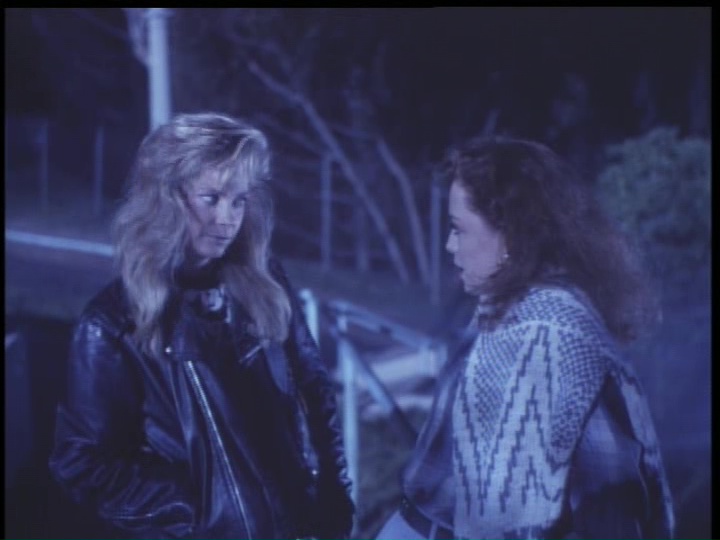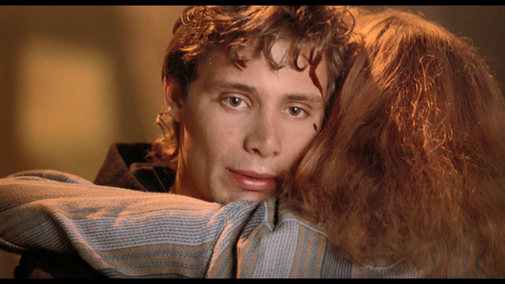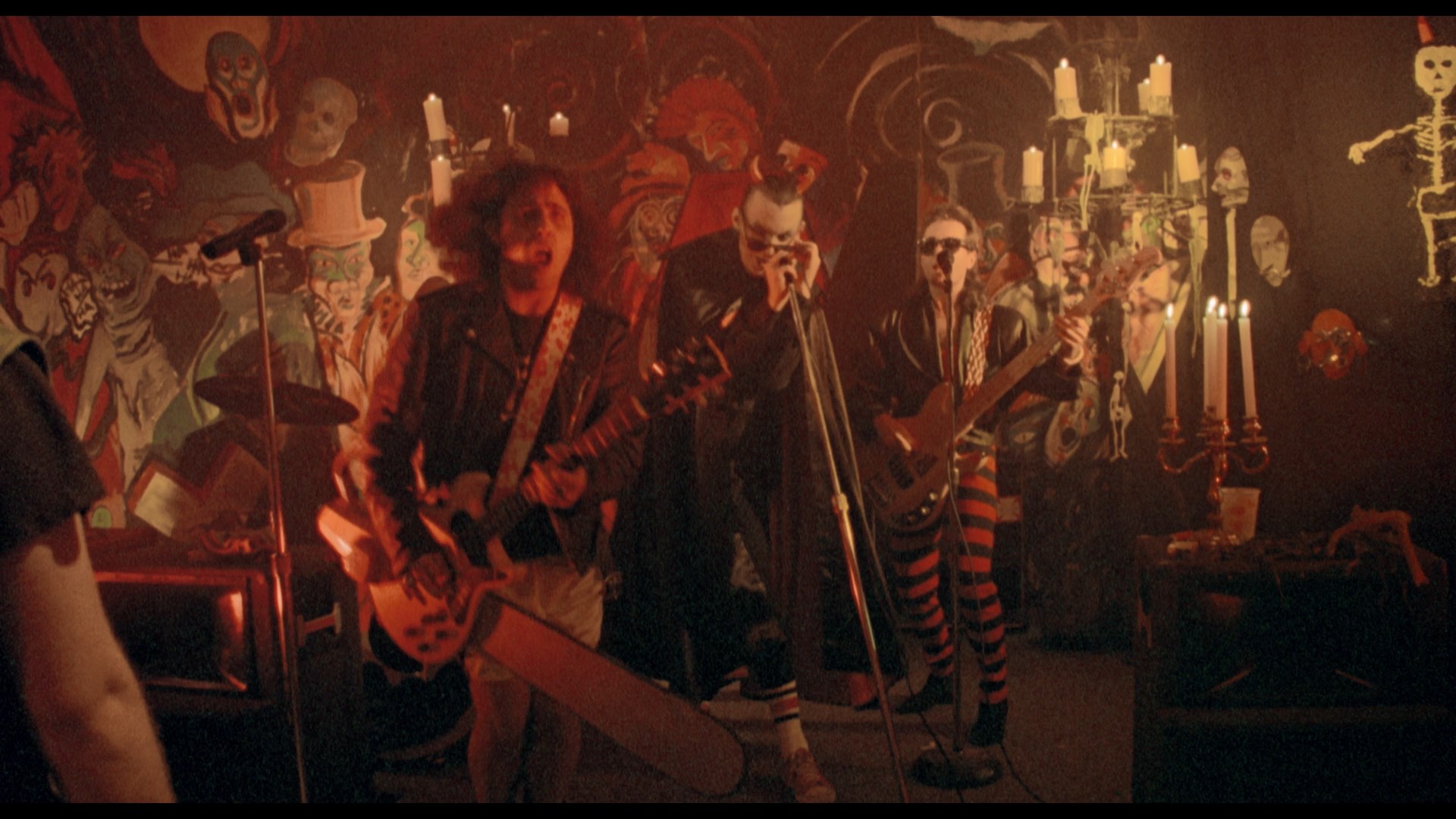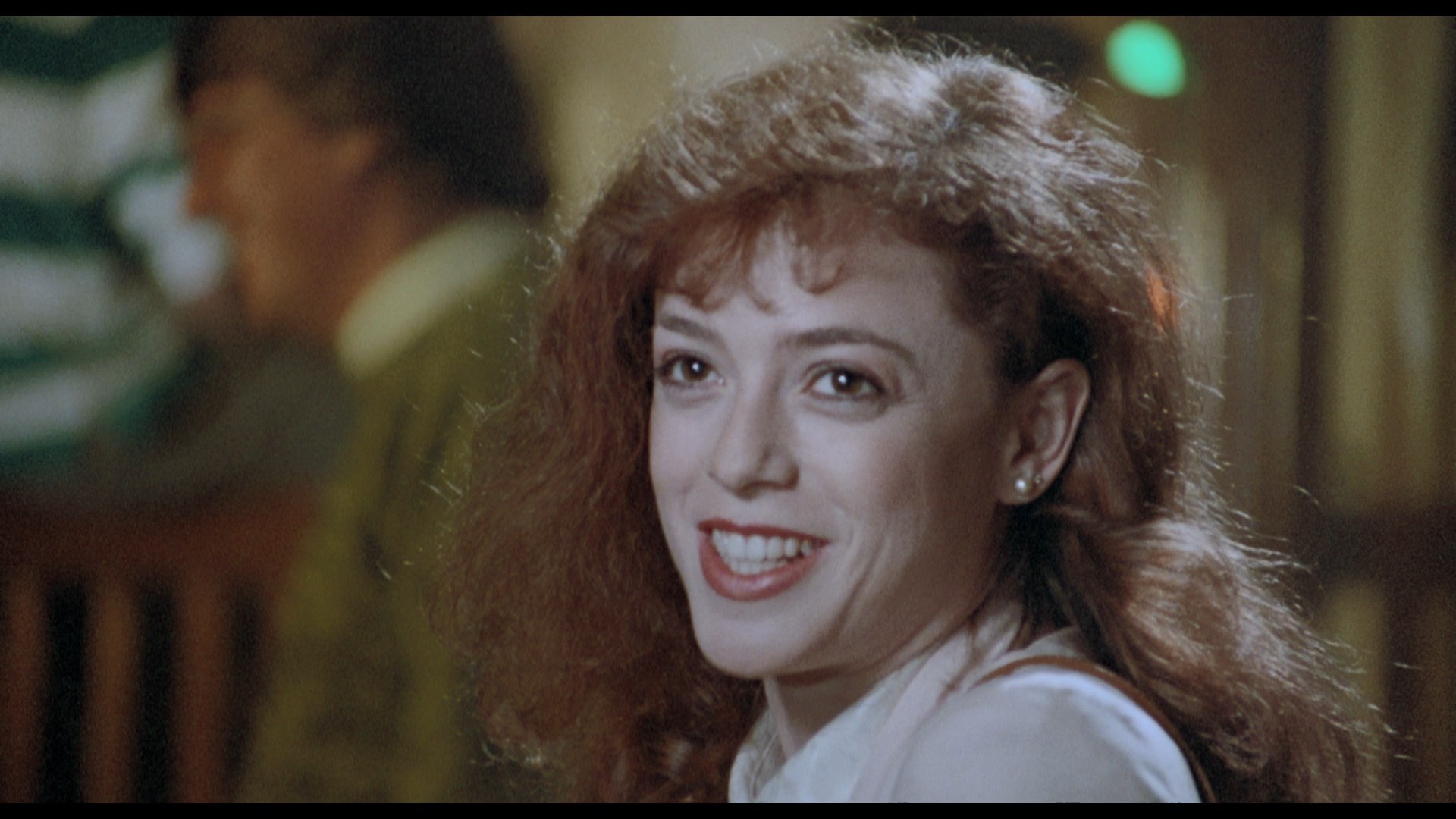 from a dated open matte video master that looked okay but unspectacular at the time with some slight image squeezing in evidence. In 20201, Vinegar Syndrome brought the film to Blu-ray (continuing its run of frat horrors after Pledge Night) featuring a new 2K scan and restoration from the 35mm interpositive (with the film somehow ending owned now by MGM under the umbrella of Orion). The Blu-ray looks significantly better with the scan bringing out detail and texture that was absent before, including natural film grain that retains the original gritty and sometimes rough appearance of the original film. Colors are bright and really pop at times, and any owners of the DVD should find this to be a significant upgrade. The restoration of the original matted compositions helps as well, bringing focus to a number of shots that seemed out of whack before. The DTS-HD MA 2.0 English track (with optional English SDH subtitles) sounds fine for the source, retaining the original Ultra Stereo mix which is essentially mono for the majority of the running time with some moderate channel separation turning up mainly during the music performances. The foursome from the long-running slasher movie podcast The Hysteria Continues! provide another fun audio commentary here chatting about campus slashers, late '80s horror, the comparative lack of gore, the sometimes puzzling home video release history, and much more. A new interview with actress Courtney Gebhart, "So 80's" (12m52s), is very upbeat and enthusiastic as she chats about her glee at getting to sing in the film, her early days as an actress, the process of shooting on 35mm on a low budget at the time, and her memories of her fellow actors as well as her director, veteran stunt man Bob Bralver. Then "Still Dean Hamilton" (12m58s) features the lead actor explaining how he came from Canada to L.A. and got started in soaps before plunging into this film, which was shot in a variety of locations around West Los Angeles (including a veterinary hospital) and allowed him and the rest of the cast to have a lot of fun during their party scenes.