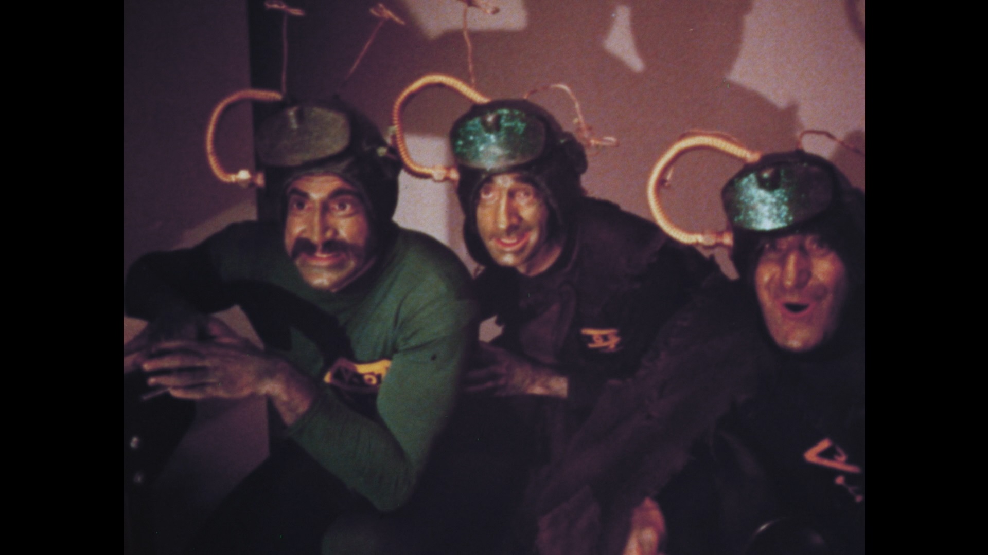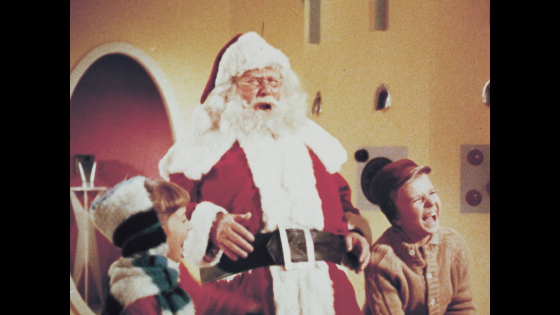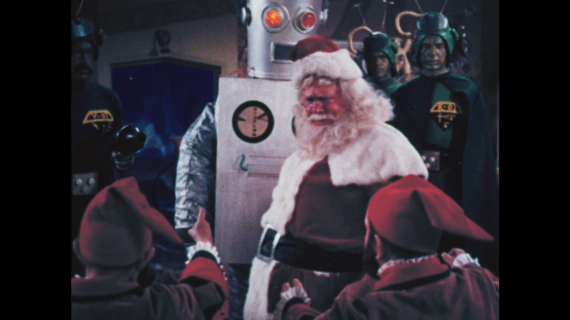 The first Blu-ray of this infamous stocking stuffer came along from Kino Lorber in 2013, with a bumpy initial pressing pulled after it turned out a master was used with 20 minutes missing. The corrected version didn't stay around for long and now goes for a hefty price, though the DVD option is still available. Extras include a newly created trailer, a stills gallery, and a "Santa's Cool Holiday Film Festival" (46m17s) reel of holiday-themed classic cartoons, commercials, and short subjects. In 2024, AGFA and Something Weird Video teamed up for a new Blu-ray edition released as Santa Claus Conquers the Martians and Other Holiday Hallucinations, this time presenting a "roadshow" version of the film from SWV's 16mm print. The film is preceded by six minutes of newly-scanned Christmas theatrical bumpers including a great 1971 one and a K. Gordon Murray compilation feature, Santa's Giant Film Festival of the Brothers Grimm. The main feature is also interrupted by an amusing intermission featuring a certain retired Oscar winner doing a Christmas Seals pitch. Transfer-wise it's quite different from the Kino Lorber in terms of color timing, as you can see from the comparison below; this