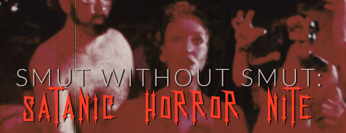 specialty programming idea called "Smut Without Smut," which made its way to its first Blu-ray in early 2021 with a pairing of Things to Come and The Dirty Dolls, two extremely rare softcore films presented both with and without their sex scenes -- sort of the cinematic equivalent of Garfield Minus Garfield, accentuating the singular quirkiness of these films once the grinding bare bodies are minimized. The mission statement for the series is as follows: "Beneath the dumpsters of America, a netherworld of 'adults only' genre movies lurks in the gutters. But what if these movies were less about the smut and more about everything else? 'Smut Without Smut' is X-rated genre movies with the X-rated bits removed. In other words, your perception of reality will never be the same." That brings us to the second installment, Smut Without Smut: Satanic Horror Nite (presented with Something Weird, a la volume one) which actually