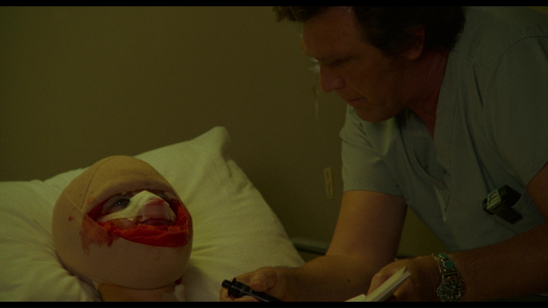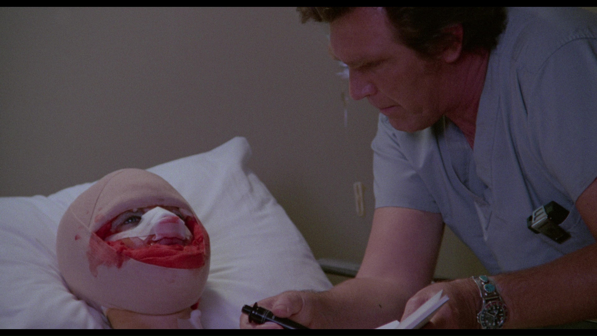 Noted plastic surgeon Dr. Philip Reynolds (Empire of the Ants' Lansing) isn't exactly the modest type, prone to boasting to his medical disciples about his skill in turning "the maimed and the deformed into the desirable." Those abilities are put the test in a most unusual way when a badly disfigured dancer named Jane (Chapman), who was severely roughed up while performing topless at a party, turns up in the road and gets taken to his clinic. Reynolds notices a striking similarity between her facial structure and that of his daughter, Heather, who's gone missing and stands to inherit five million dollars from her grandfather. Jane goes along with the plan to pass herself off as Heather, but her coming home celebration and quick retrieval of the cash is complicated by the fact that the doctor has a nasty violent streak and no one seems to know where the real Heather actually is.