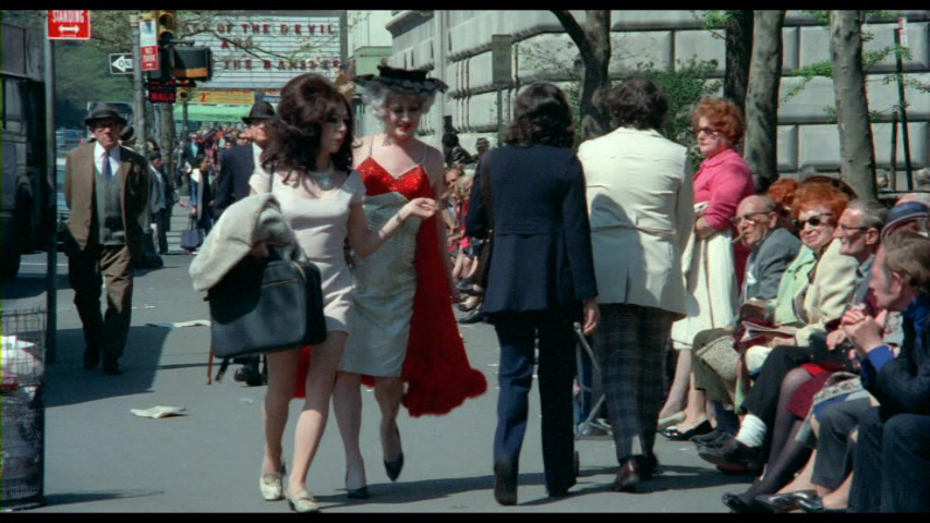 Mark of the Devil and Cry of the Banshee behind our two scene-stealing transvestites (one of them doing her best Holly Woodlawn impression).