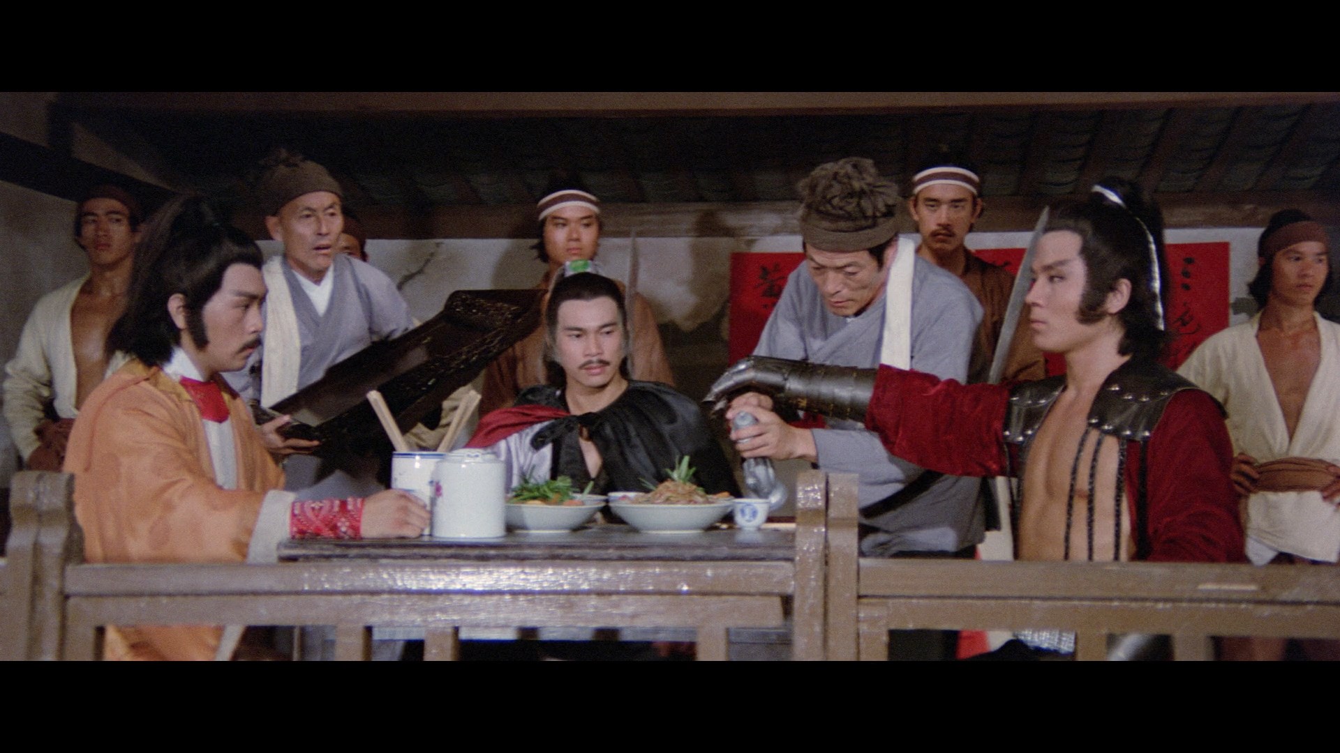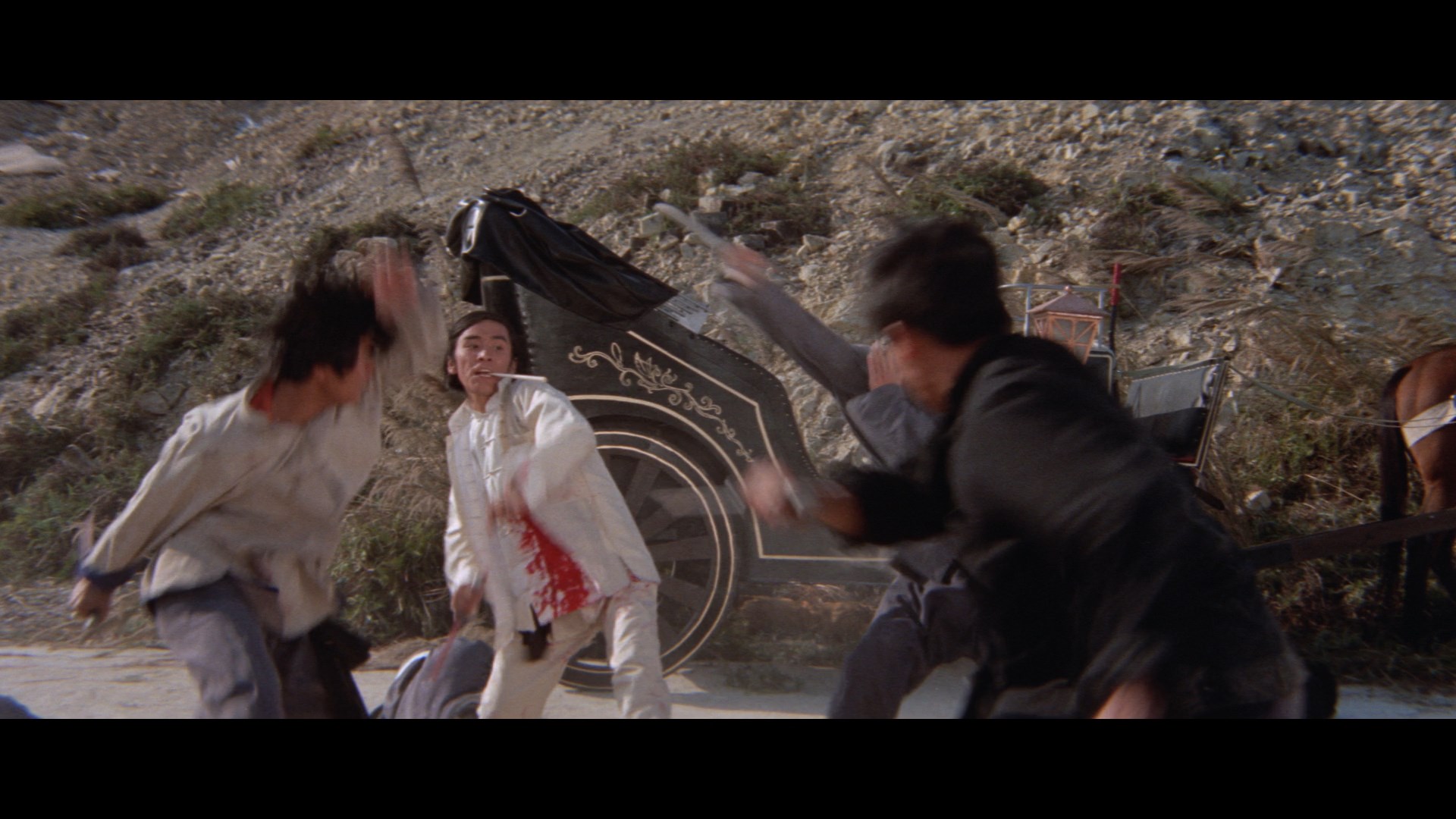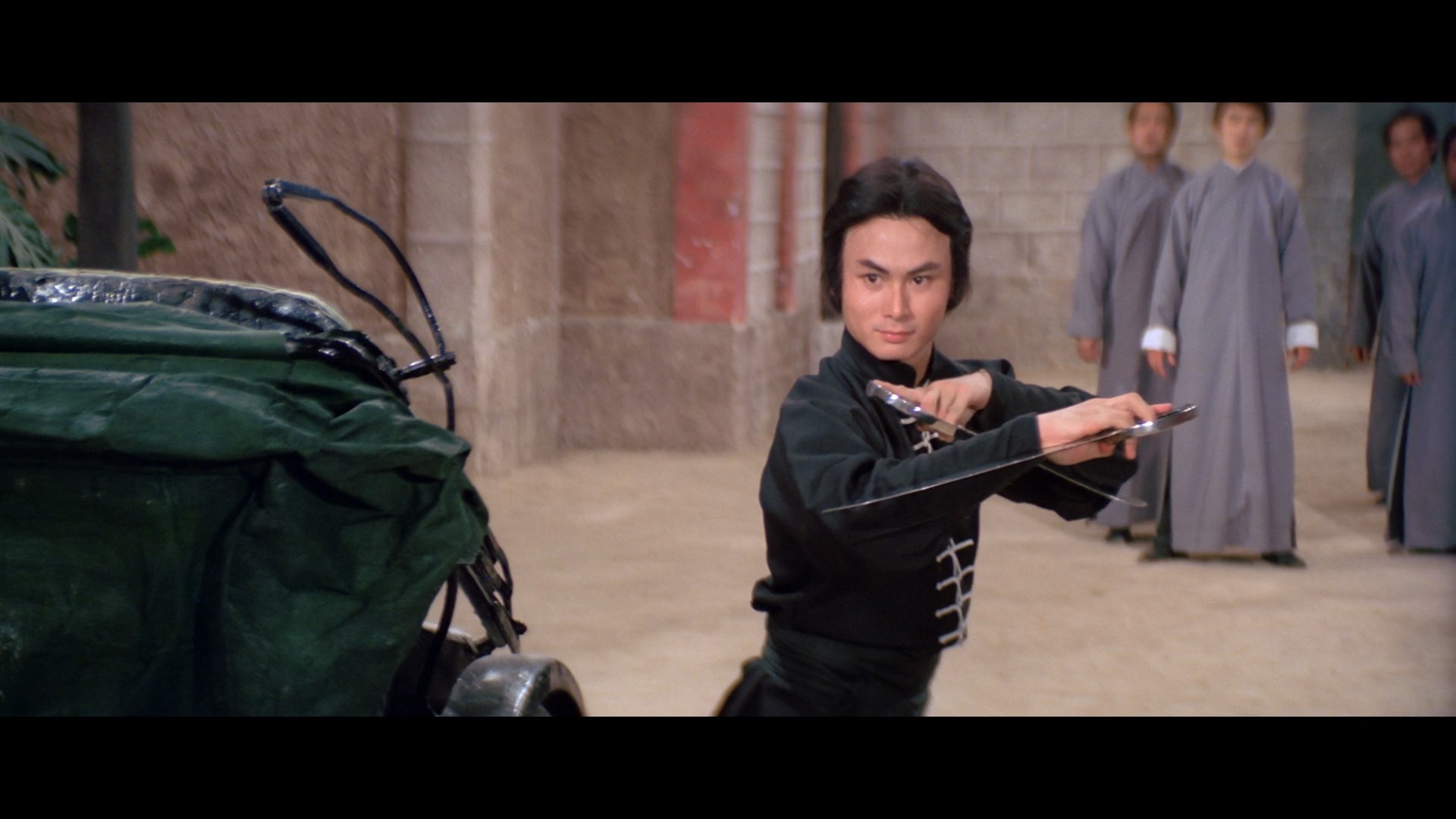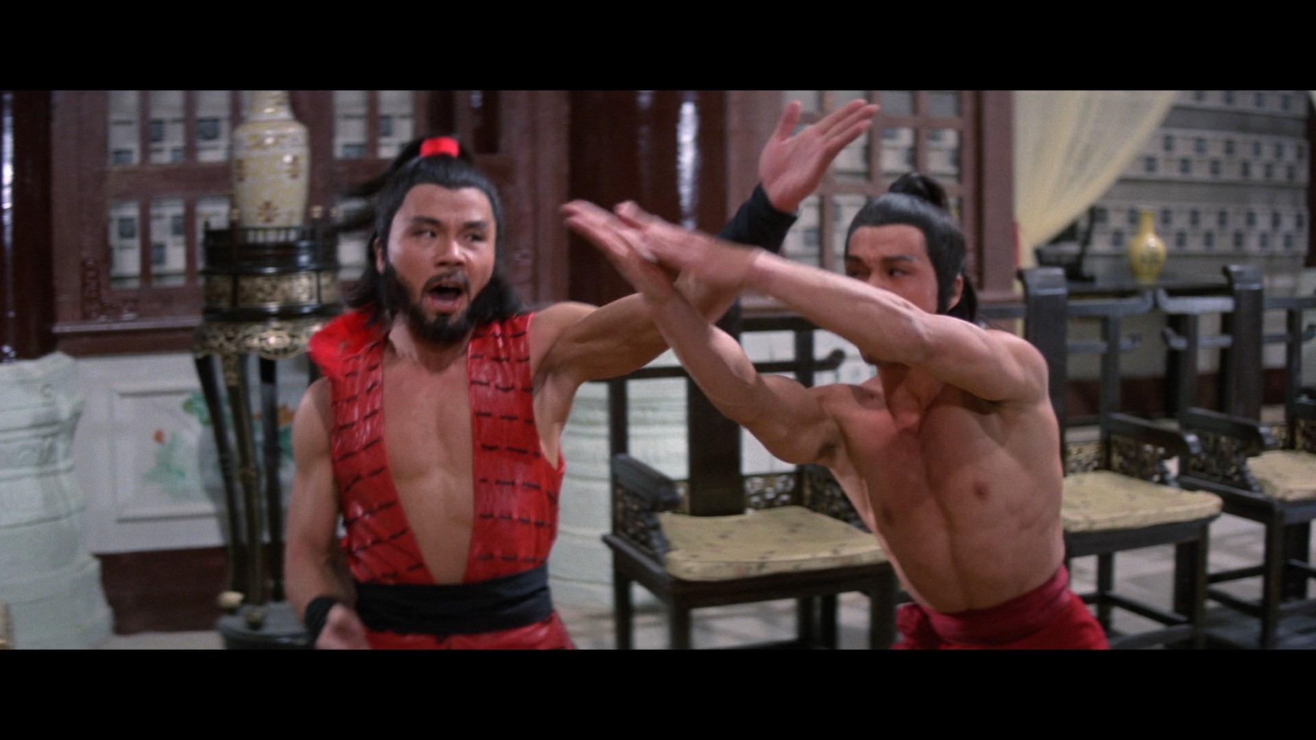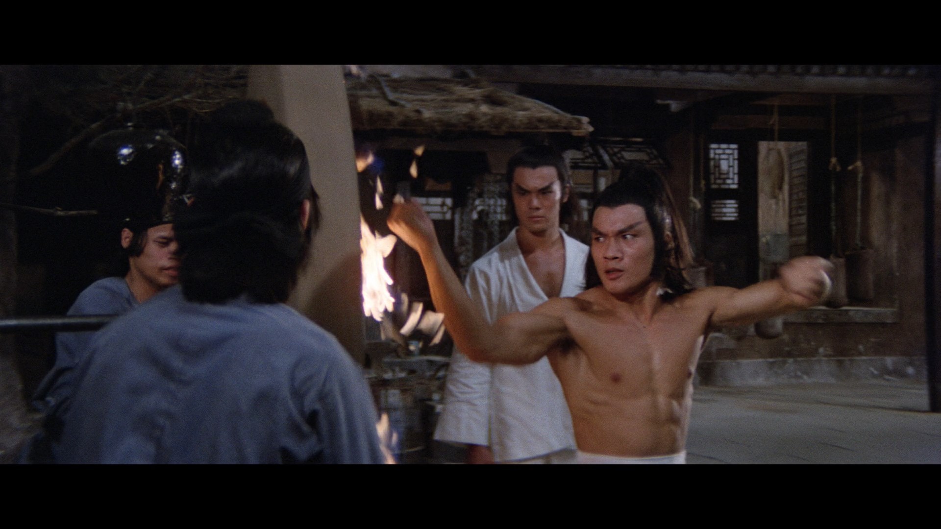 The first legit U.S. release of this film was a DVD from The Weinstein Company's Dragon Dynasty line, featuring the Mandarin and English tracks, taken from Celestial's PAL master without any time adjustment (so it runs short and at a higher pitch at 101m36s). The main reason to hang on to that one is an exclusive commentary by David Chute, Elvis Mitchell, and Quentin Tarantino, which covers the film's impact within the kung fu movie craze and the major players involved. That disc also includes interviews with director Chung Chang-wha (or Chang-hwa Jeong) (5m12s), action director Lau Kar Wing (19m25s), and David Chute and Andy Klein (6m52s). The Arrow disc sports a greatly improved new 2K restoration (made from a 4K scan of the negative) that runs at the correct speed and looks gorgeous throughout; the Mandarin and English audio options are provided in DTS-HD 1.0 mono with optional newly English translated or English SDH (for the dub) subtitles, a configuration present on all of the other titles as well. Here you get a new audio commentary by David Desser (co-editor of The Journal of Japanese and Korean Cinema and The Cinema of Hong Kong), who presents a thorough history of the film, its timing in the Shaw Brothers canon, the cast, and the techniques seen in the film. A new video appreciation by film critic and historian Tony Rayns (42m56s), sketches out the history of Shaw Brothers from the 1920s and traces it to the heyday of the martial arts era, including the return of Bruce Lee to Hong Kong and the ascension of Golden Harvest. One major score in this set is a batch of interviews conducted by Frédéric Ambroisine from 2003 to 2007, and here that includes ones with Chung Chang-wha (39m54s) and star Wang Ping (25m51s) including a ton of history about the studio. Also included is an interview with Cho Young-jung (33m24s), author of Chung Chang-wha: Man of Action, who provides an extensive overview of the director's career. Originally commissioned by Celestial back in 2003 and seen on some of its martial arts releases is Cinema Hong Kong: Kung Fu (49m36s), the first in a three-part documentary on Shaw Brothers’ place within the martial arts genre with interviews by the likes of Jackie Chan, Jet Li, John Woo, Sammo Hung, Gordon Liu, Lau Kar-leung, Cheng Pei-pei, and David Chiang. Also included are the American American Warner Bros. main titles as Five Fingers of Death, two Hong Kong trailers, two German trailers, a U.S. trailer, a TV spot, and radio spot, plus a digital reissue trailer created by Celestial. (To avoid repetition, all of