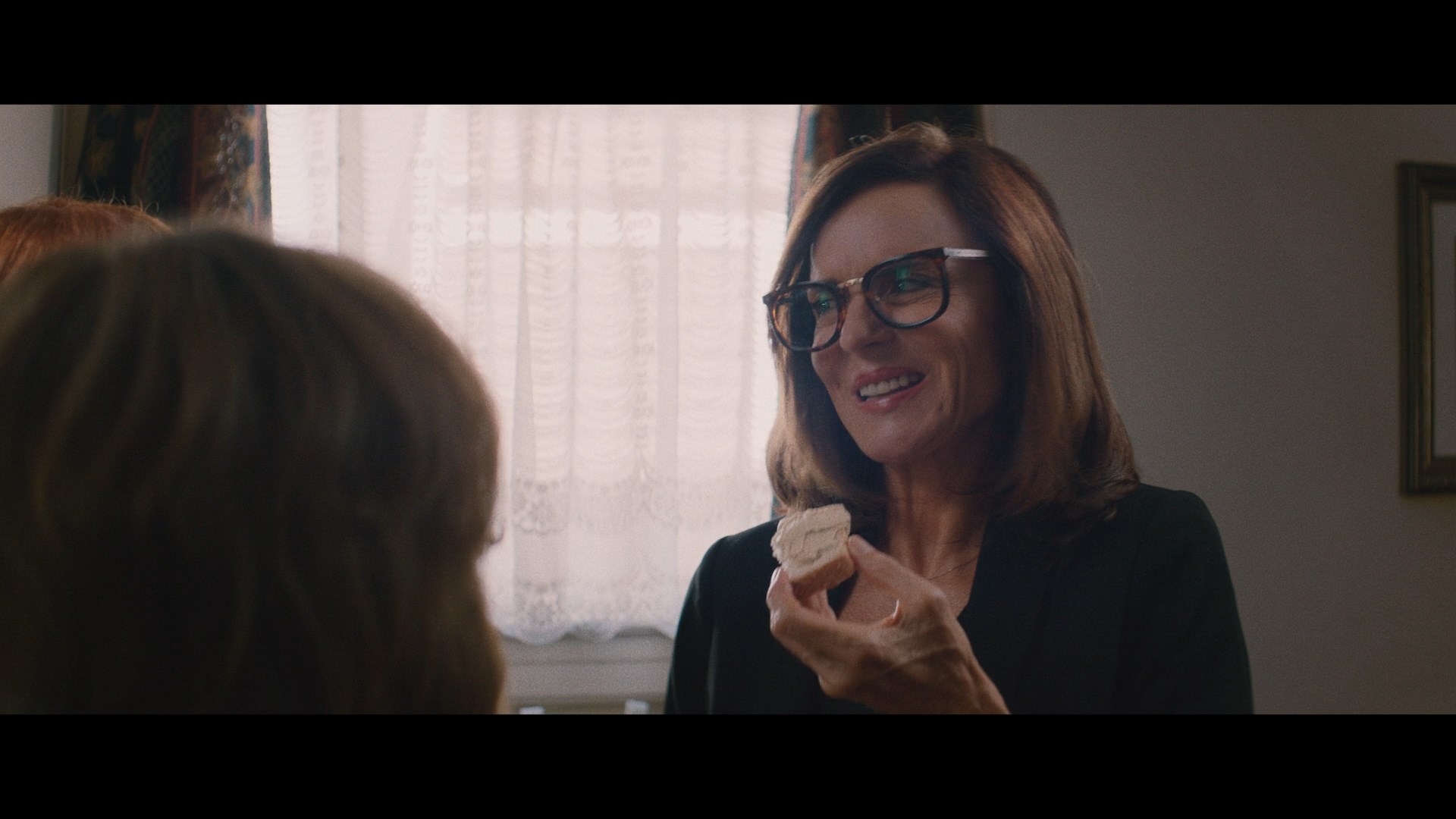 Apart from the brief opening scene, Shiva Baby unfolds in real time for maximum anxiety-inducing effect with an escalating string soundtrack amping up both the comedy and suspense. (In that respect among others, the frequent comparisons between this and Uncut Gems are dead on.) It's s deft juggling act that first-time feature director/writer Emma Seligman (adapting her short film of the same title) pulls off extremely well, including some hysterically clever bits of visual framing involving reflections and windows throughout. Obviously the film is very low budget (though the lox and bagel expenditures must have been astronomical), but the cast is still peppered with familiar faces including some great bits for veteran character actors like Jackie Hoffman.