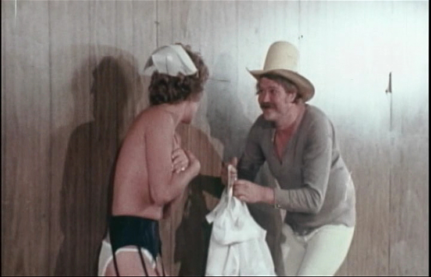 On a similar note, the Hillbilly Sex Clan Grindhouse Triple Feature meditates on the theme of country bumpkins getting busy in the backwoods. Country Doc features a bunch of yokels whooping it up in a barn, and then the title character shows up to inspect three of the shapliest young daughters of the community. The girls decide to make a return appearance with the next guy to ride up on a horse, while the doc goes off to attend to another female patient. Eventually it all goes into roughie territory with shotgun mayhem, kitchen chair bondage, and a big farmhouse orgy for the big climax. This one looks like it was originally shot softcore and spiced up with inserts, a pretty common but annoying practice at the time; as such it's a stupid but fairly entertaining cheapie that stops dead for grinding close ups every now and then. For some reason this one's vertically squeezed, as if it was 16x9 transferred and then erroneously encoded as full frame for some reason; adjust your TV accordingly. The title feature, Hillbilly Sex Clan, is a retitled new transfer of the home video staple, Daisy Lay, Ozark Virgin, one of the better southern fried porn quickies thanks to a more attractive cast than usual and an atmosphere similar to the softer Harry Novak country cutie films of the time. Virginal Daisy Lay (Maria Arnold from Necromania and The Toy Box) enjoys hanging around the farm and watching her brother (George Peters) cavorting outdoors with random girlfriends. Eventually curiosity gets the better of her, and after dabbling a little bit on a car hood with a mustachioed schmuck, she and bro jump into a foursome on the family couch. It's actually a pretty funny, lively, and short timewaster, and the cast is better qualified than most to pull off some of the sillier dialogue. Finally in Bare Country, a bunch of rednecks have sex with each other. They swap out each other and different rooms in their house, and that's pretty much it. All are full frame and look reasonably decent considering their origins.