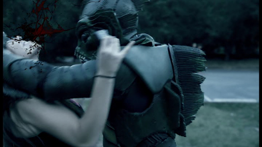 There's an obvious '50s monster influence to be found here courtesy of the (pretty good) rubber suit and heavy emphasis on dialogue, though the aforementioned digital blood is a major distraction; in this case, old school all the way would've been better. However, if you want to just put your brain on hold and watch a lizard guy tear through a huge cast of characters, this should be just the ticket. The Camp Motion Pictures release looks fine considering the heavy color grading done on the film to give it a gray/green cast, and the sole extras are a lot of unrelated trailers.