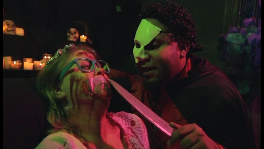 It was probably inevitable that someone would make a movie called Phantom of the Grindhouse, and here we have it with an extended homage to a certain Robert Rodriguez/Quentin Tarantino collaboration complete with an opening reel of fake trailers for movies like Invasion of the Mud Spiders and Something (about a killer black pug). There's also a host clad in a black hood and cloak to kick off with the film ("You'll kick off your pants and scream!"), with the whole thing running a very brief 65 minutes. Some very stupid, very dramatic kids in the Sleepy Hollow Heights Horror Club are upset that their local repertory theater (which looks way too nice and clean to be a grindhouse) is about to get shut down, so they decide to throw a 24-hour marathon to raise money to keep it afloat. Meanwhile a masked homeless psycho lurking in the depths of the theater is sharpening his butcher knife and fixating on his dream girl, goth goddess Christine.