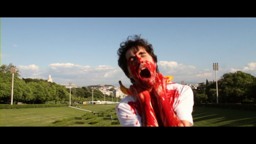 Now we arrive at one of the most eye-catching titles you're likely to run into: Banana Motherf*ck*r, a jaw-dropping Portuguese short film from 2011. Essentially in the same spirit as the instant classic Treevenge, it starts off with a group of camera-toting explorers heading into the jungle and awakening an ancient evil that gives murderous life to every single banana in the area. Soon the cast is decimated in a banana holocaust of eye-gouging, dismemberment, and mutilation, quickly spreading to the mainland where the rampage transforms into a rapid-fire parody of movies including Jaws, A Nightmare on Elm Street, The Evil Dead, and Raiders of the Lost Ark, among many others. It's a pretty spectacular achievement from director Fernando Alle and the gang at Clones, whose output is also represented on the same disc with two bonus shorts. The amazing Papá Wrestling from 2009 might be the best anti-bullying short ever made as a poor bespectacled kid gets his Robot Attack lunchbox stolen at school by some nasty classmates, who shove his face in the toilet for good measure. However, it turns out the victim's dad who fixed his lunch is an angry wrestler... and things get very, very ugly. There's also a storyboard gallery and a Frightfest "phone promo" for this one. Then there's Blarghaaahrgarg, in which a down on his luck exterminator is called into a lab where his roach hunting turns into a bit of a mishap. Back home at his apartment, he finds he's unleashed a ravenous monster that devours everything in sight and sprays his walls with blood. Can his exterminating skills save the day? Also included for this one are a trailer and a making-of featurette showing the creation of the refreshingly old-school creature. Some other odds and ends include a "game of trust" (a goofy one-minute camcorder short with a wild punchline at the end), a funny (and splashy) outdoor special effects demonstration, a bonus head-squashing gag, some bonuses for the main short film (a minute-long deleted scene, random human and banana interviews, and a trailer), and the usual batch of Troma promotional miscellany.