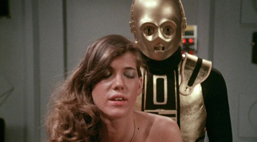 a brief appearance by Bill Margold as the business suit-clad track manager, the legendary Ron Jeremy, and one-shot actor Rocky Balboa (where'd they get that name, hmm?), who deserved more of a career. The race sequences are actually pretty good, and it also offers a fascinating look at the sponsorship and compromises that go into surviving the sport with a nifty early feminist slant of sorts as well. This was issued on VHS from Essex and later bootlegged in ragged, censored form as part of an Alpha Blue Archives set dedicated to Parker. However, the Vinegar Syndrome disc is the one you want as it's complete, correctly framed, and looks gorgeous; there's also a trailer and whopping 16-minute reel of alternate softcore versions with different takes for most of the sex scenes. Also on the disc is McHaley's much weirder debut film, 1979's Starship Eros, which is even shorter (67 minutes) and belongs to that weird, surprisingly prolific subgenre of Star Wars porn imitations. This time we even have a C-3PO lookalike named Quasar, a robot aboard the title ship inhabited by an all-female crew in the futuristic year of 1995. Commander Lily Rodgers leaves behind her boyfriend (Mike Ranger) to explore the stars, as well as her shipmates like Becky Savage, Holly Joy, and Tara Flynn, with Quasar doing his duty when they need some variety. And... that's pretty much it. The whole thing is incredibly goofy and not exactly erotic unless you have a '70s George Lucas fetish; needless to say, the eccentricity value should make this one a hot commodity among collectors. This one's never hit home video at all before (probably due to that robot mask) but looks excellent here after some pretty tattered opening credits. The trailer is also included for this kooky rarity along with a 2-minute audio intro by producer Wesley Emerson for what seemed like a virtually lost item a few years ago.