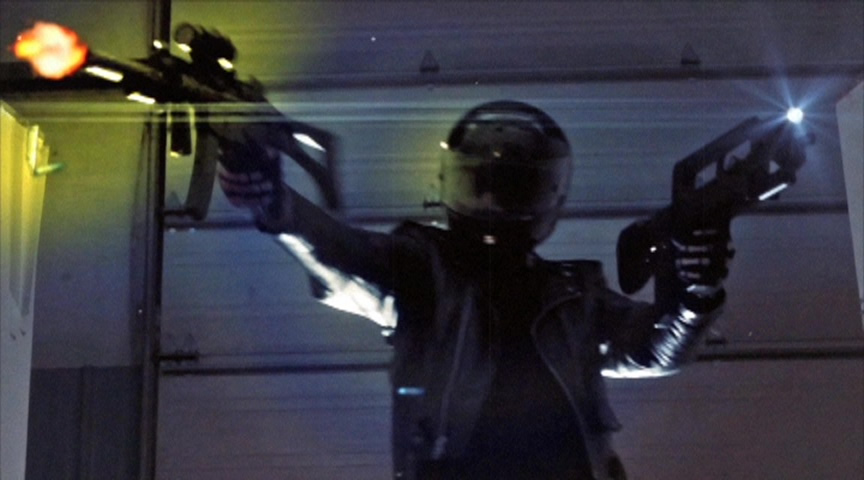 It's surprising no one's come up with a movie called Homicycle before, but at last here we have it courtesy of this 2014 horror spoof from Canadian director Brett Kelly (My Fair Zombie, Jurassic Shark). In fact, Kelly (sporting a lounge lizard outfit and gigantic fake mustache) kicks off the film itself with a William Castle-style bit of hoopla, leading to what amounts to an elaborate homage to films like The Exterminator, Nail Gun Massacre,and Vigilante (with, I guess, a dash of the "Chopper" episode from The Night Stalker). Someone's cleaning up the trash in a dangerous city, and he's riding a mean hog with a sleek motorcycle helmet obscuring his face. Our avenging angel is first seen taking out an abusive pimp by shoving his hand into the bike's spinning wheels, and as it turns out, his motive is tied to the brutal beating and death of a cop by some thugs just a short time earlier. The dead cop's widow, Julia (Candice Lidstone), is trying to take down the crime kingpin responsible, Brock (Peter Whittaker), who smacks people around and barks orders in the strongest Canadian accent you've ever heard, but the mystery avenger has his own plan to take Brock down at any cost. Featuring some hilariously excessive kills, a great rock club sequence, lots of women in bikinis, a thumping '80s-style electronic score, and an insane theme song, this one never wears out its welcome at 70 minutes and does a solid job of duplicating the scrappy look of 16mm indie films from the Reagan era without resorting to any obnoxious fake grindhouse scratching and scuffing. (There's a brief refreshment stand intermission that was presumably added to pad out the running time and could've been dropped, but you can just skip past that.) Plenty o' fun. The Bloody Earth DVD features a nice anamorphic transfer that captures the intentionally grungy look of the film itself, while extras include a fun audio commentary with Kelly (whose accent could give the villain's a run for its money!) and a bunch of bonus trailers like Animosity, Babysitter Massacre, Lizard Man, and Murderdrome.