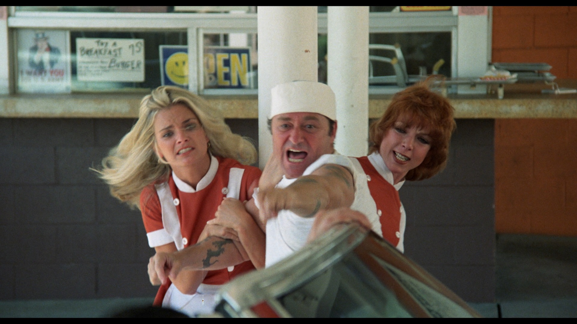 set is the second disc, a Blu-ray of the 1978 comedy Starhops directed by Barbara Peeters (Humanoids from the Deep) who co-wrote with Stephanie Rothman. This one's been out of circulation since its fairly obscure '80s VHS releases in the U.S. and U.K., now presented here uncut in a gorgeous 2K scan from the original camera negative. The film got an R rating at the time but is actually pretty wholesome as it chronicles the antics at a drive-in fast food joint where cook Dick Miller takes care of the problem customers for the carhops including Angel (Firecracker's Jillian Kesner), Danielle (Dorothy Buhrman), and Cupcake (Sterling Frazier). There's some semblance of a plot involving a jerk businessman trying to sabotage the business so he can swipe the land for a gas station after Dick lets the ladies take over, but mostly this is a breezy location hangout movie in vogue with others of the time like Drive-In, Record City, Thank God It's Friday, and so on. It's a lot of fun and great to have looking and sounding so good; the set also comes with an insert booklet featuring an essay by Caelum Vatnsdal, author of You Don’t Know Me, But You Love Me: The Lives of Dick Miller.