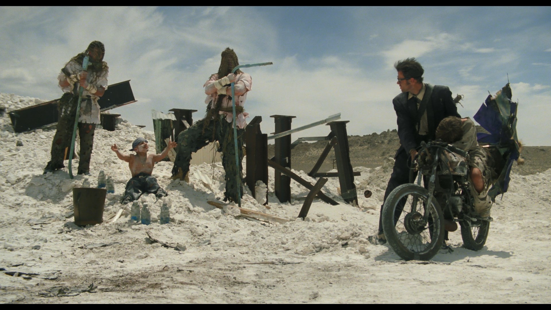Tyler, The Red Elvises, producer Leanna Creel, first assistant director David Riddick, former Panavision marketing executive Tracy Morse, and executive producer Michael Burns, with a split-screen approach that works better than the Zoom calls we've been seeing for the past year or so. It's great stuff as they go through the script process, storyboarding, coming up with the pseudo-dubbed dialogue approach since they weren't shooting with sync sound, shooting in Death Valley, and tons more. Note that for some reason this is divided into separate files (20m23s, 21m23s, 17m53s, 16m27s) that should play consecutively, though at least on one Oppo used for this review, it bounced back to the menu after the first segment -- so chapter skip if you must to make sure you see the whole thing. Also included is Mungia's 1996 short "A Garden for Rio" (15m8s) about an elderly couple's life-changing quest to start a garden, presented here in a nice HD film scan, plus an extensive behind the scenes gallery (6m55s).