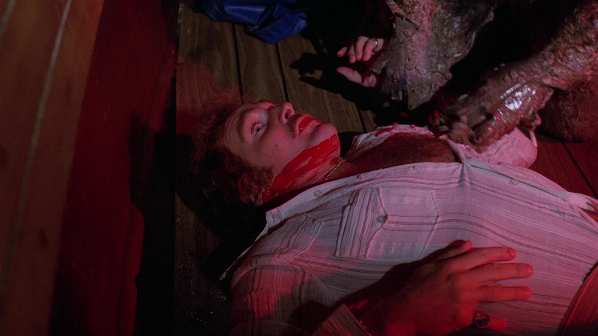 In 2017, Code Red revisited the title for a Blu-ray release (sold via Ronin Flix and internationally by Diabolik) featuring a very colorful limited slipcase design. The new HD transfer from the original negative (bearing the Spawn of the Slithis title) looks much, much better, and presumably since it's from better elements with less damage, it also runs a bit longer (now 86m38s compared to the DVD which ran 86m21s). Colors are far richer and healthier, detail increases by a huge margin, and textures are far more tactile and easier to make out here even in the darkest scenes. The DTS-HD MA English track also sounds cleaner and more robust by comparison. A brief, goofy deleted scene (1m6s) with lost sound is also included, along with the theatrical trailer and bonus ones for The Being, Sole Survivor, and The Dark.