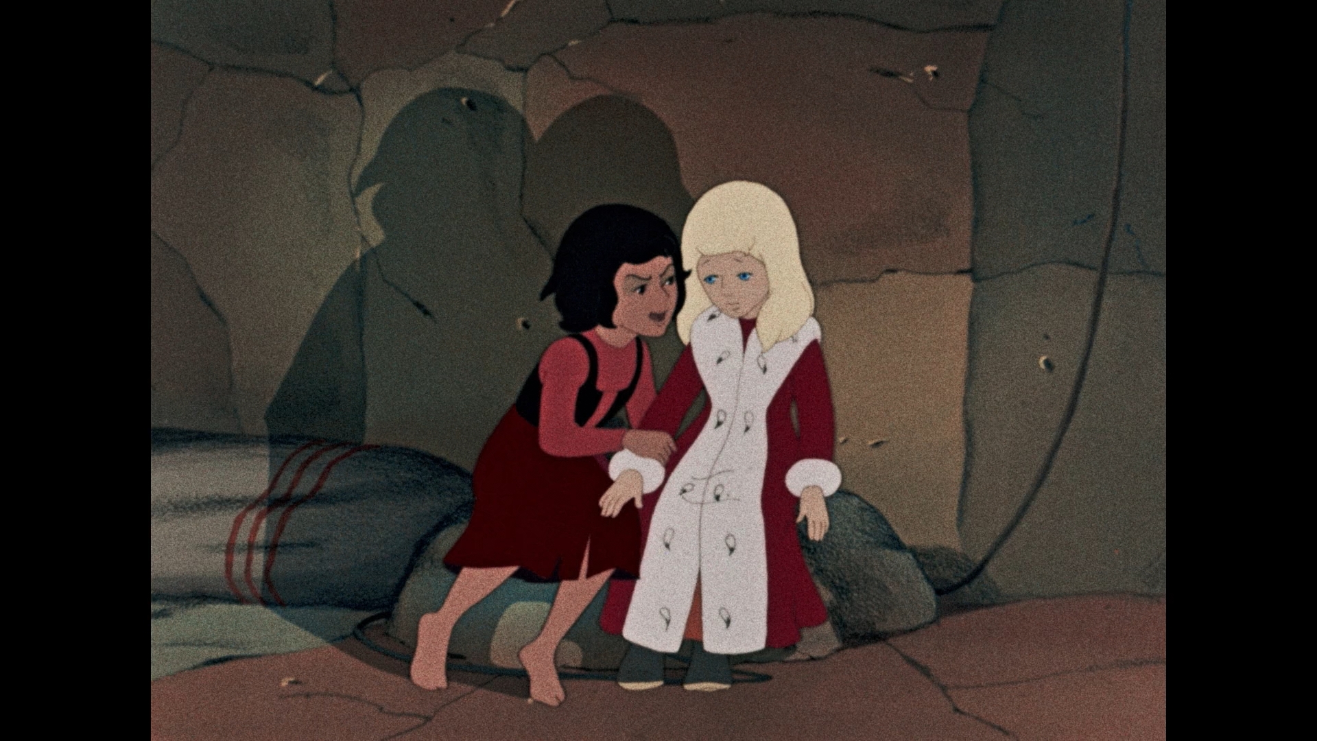Volume two shifts gears to pure fantasy with the films of Lev Atamanov including his legendary The Snow Queen, a familiar title among animation fans as the favorite of Hiyao Miyazaki and one that inspired him to keep going in his chosen career. The film is one of the earliest adaptations of the famous Hans Christian Andersen, which was later redone many times and served as the inspiration for Frozen before undergoing a major script overhaul. In the works for two years, the film earned some of the widest international distribution for a Soviet animated film and was usually dubbed with high-profile voice artists from each region (with Sandra Dee and Tommy Kirk recruited for the heavily reworked U.S. version, later redone for home video with Kathleen Turner and others). In this version, a little old elf tells the story of Kai and Gerda, inseparable children who like to pass time growing roses. In the dead of winter, Gerda's grandmother tells them about the Snow Queen, provoking Kai to make a nasty remark that angers the mystical ruler. She puts a spell on the boy via two ice shards and takes him to her ice palace, with Gerda in pursuit and gaining
