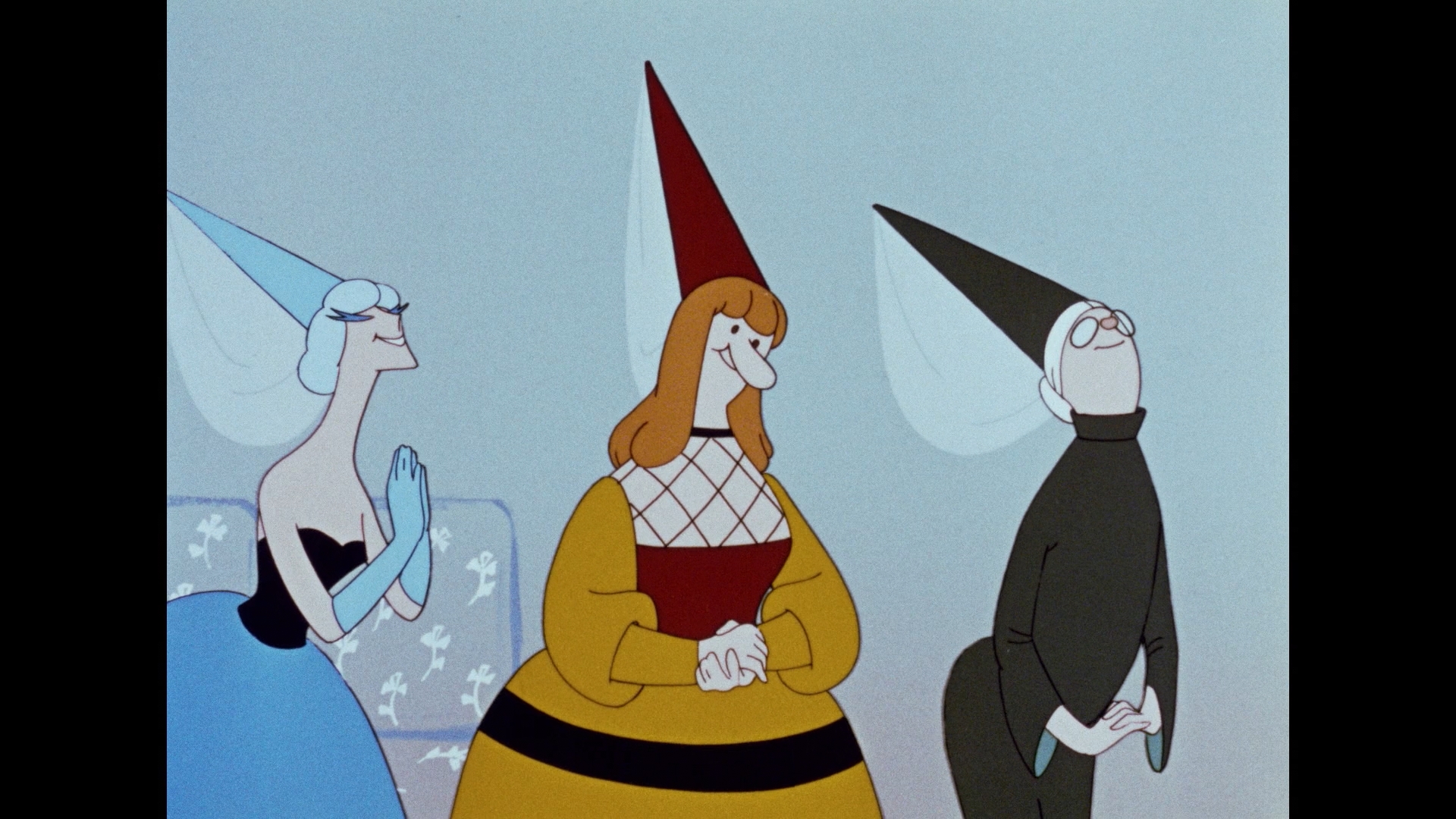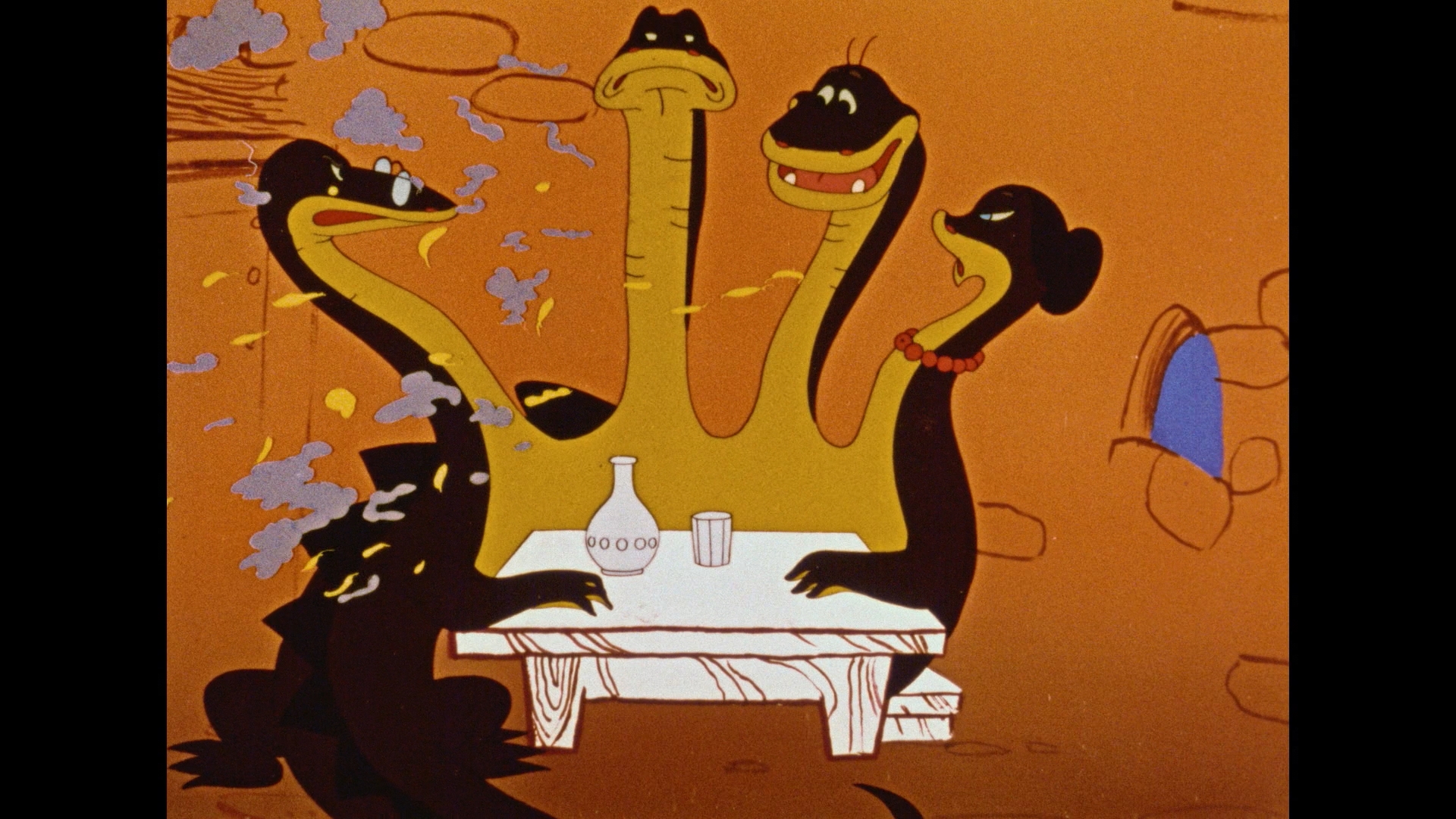 fairies who bless a newborn boy with a magic ball of string and a promise of a fulfilling life. With the child growing at an accelerated rate, his grandfather protests the easy path he's been given ("Those who do not work, do not eat!") and embarks on a quest to the Land of Happiness where he and the boy learn the cost of laziness and indulgence. Also, there's a four-headed dragon and a lot of robots and sentient tools. Propaganda in fairy tales is hardly unique, and this one pushes it in a crazy direction with the increasingly exasperated grandpa navigating fanciful obstacles galore to get to the lesson of the story -- all with a very stylized look common to what you'd see in the 1960s. Again the restoration of the Russian-language film is immaculate, with Giesen delivering another commentary laying out the climate of the time that produced this, Atamanov's status as a premiere name in state entertainment by this point, the state of Soyuzmultfilm by this point, and the market for medium-length projects like this. On the video extras front, Chester's visual essay "Written with Ice Crystals: Master Soviet Animator Lev Atamanov and The Snow Queen" (19m5s) surveys the maestro's career, his transitional status in Soviet animation history, the basic principles guiding his work, and the key films along the way. In "Innocence & Cynicism: The Snow Queen and Hayao Miyazaki" (10m48s), John Adkins of Animation Obsessive hones in on the fairy tale film's importance to the Japanese animation legend, the impact of its release in Japan, the resonance of Gerda's character, and the lingering effects its screening in the mid-'60s had on the younger director's work throughout his career. This one is also available as a standard version or a limited edition, the latter featuring a slipcase with art by Haleigh Buck and a booklet with essays by Giesen (who delivers a very thorough, extensive breakdown of Atamanov's career and early Soviet animation) and Walter Chaw analyzing the themes and fairy tale elements of all three films.