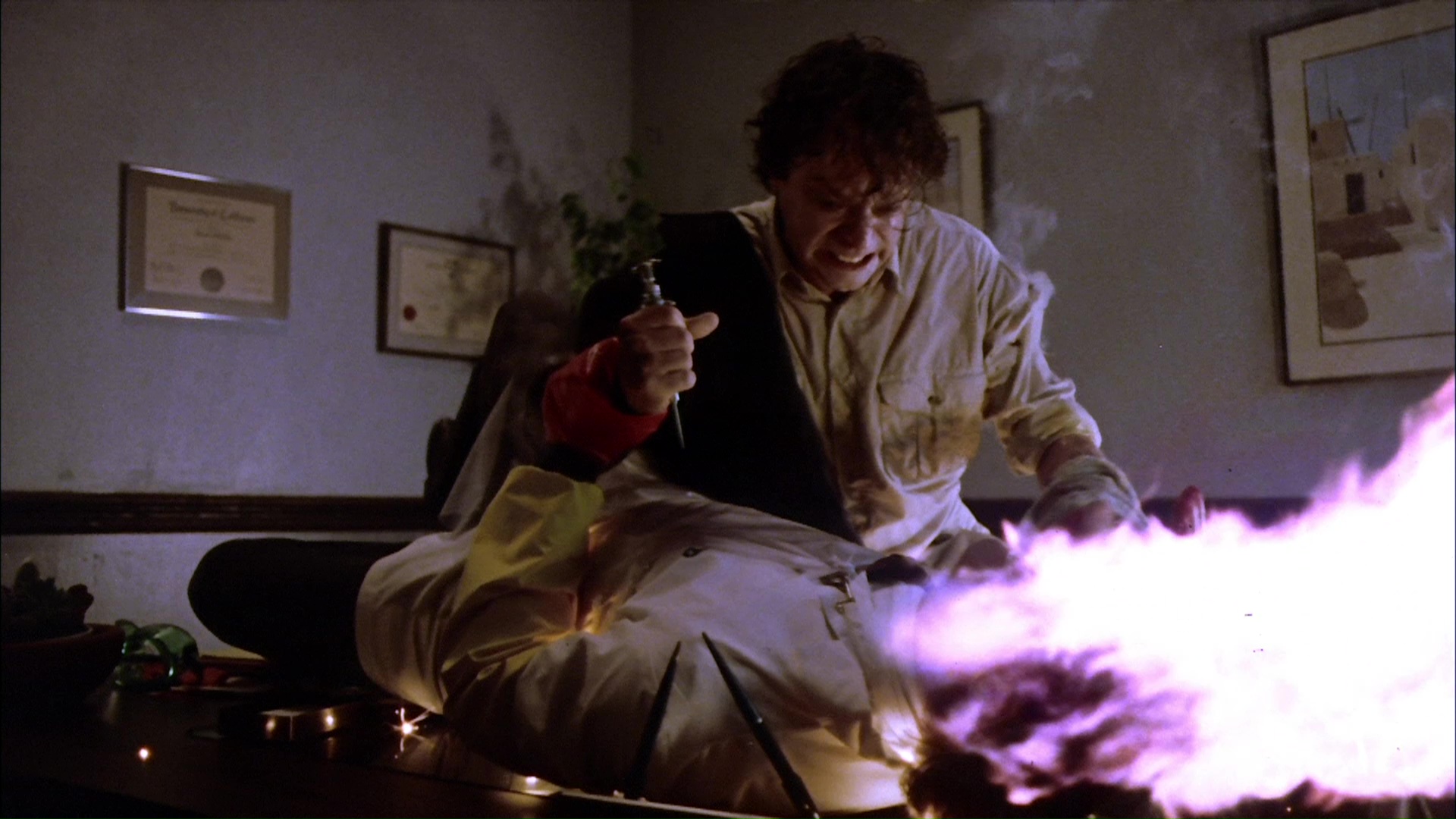speckled with glitter running lines for a production of King Lear and eventually running through every emotion in the book by the time it reaches the big fiery climax. On top of that you get a surprising array of supporting characters including a fun femme fatale turn by Rock 'n' Roll High School's Dey Young (with some cool blonde streaks) and solid roles for old pros like Melinda Dillon and TV vet Jon Cypher, not to mention a small bit for none other than Dick Butkus and cameos from two horror directors, John Landis and House of Wax's André De Toth. Also noteworthy is the rich, effective music score, an early effort for composer Graeme Revell who had just come off of Dead Calm and would go on to do Pitch Black, The Crow, Bride of Chucky, and Freddy vs. Jason among many others. All in all, it's no classic by any means but the fun, scenery-chewing performances and often wild practical visual effects make it an enjoyable ride for '90s horror fans.