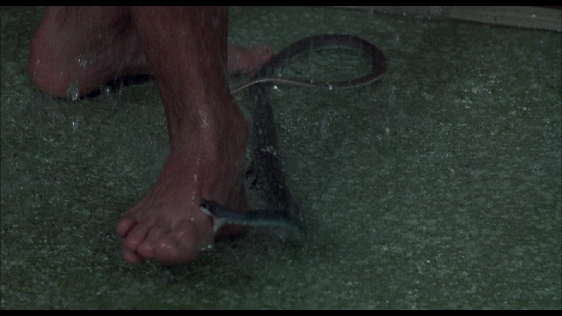 This film marked a rare big screen effort for director Bernard L. Kowalski, who mostly worked in episodic television and occasional made-for-TV movies like The Woman Hunter and the creepy Black Noon. (In fact, this was only his fourth – and final – big screen effort after odd choices like Krakatoa: East of Java, Stiletto, and Macho Callahan.) His TV aesthetic is still in place here with mostly workmanlike visual setups, but he also clearly revels in the chance to pelt the viewers with slithering snake imagery that would’ve been way too strong for TV viewers in ’73. Some amusing post-production censorship was imposed via optical leaves and a lamp to cover up some exposed skin during a skinny dipping scene and a post-coital scene, though it's far more careful to cover up Menzies than Benedict or a young Reb Brown (Yor) whose slo-mo shower attack is uncensored here compared to some past video and TV prints. Needless to say, a PG back then meant something completely different. It’s still fun to see a young Benedict here years before he became TV’s go-to cocky smartass in Battlestar Galactica and The A-Team, mostly looking sincere and confounded as he goes through some nasty transformations. The snake procedural aspect is really the film’s strongest suit as we get some great footage of the actors handling and researching snakes, including a startling real venom milking moment and lots of great close ups of the scaly stars in action. If you ever wanted to find out how to force feed a black mamba, look no further. And thankfully unlike some other nature horror films (looking at you, Food of the Gods), this one has the good sense to use a (very obvious) wooden stand-in for an animal getting pumped full of bullets, though there is a (not explicit) skirmish involving a mongoose at the climax that still had UK censors reaching for the scissors.