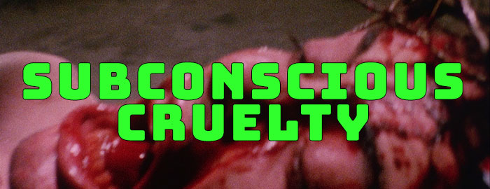 highly explicit meditation on man's relation to himself and the world around him, Subconscious Cruelty further blurs that already shaky line between art house pretension and unrepentant sleaze. Though the framework revolves around three (or arguably four) stories, this Canadian time bomb concealed in celluloid is definitely way beyond the land of Amicus and EC Comics. Best known to the film festival crowd at the time for their involvement in the annual Fantasia film festival, director Karim Hussain (who later went on to shoot Hobo with a Shotgun and multiple Hannibal episodes) and producer Mitch Davis (who previously collaborated on Davis' directorial debut, Divided into Zero) had to endure an obscenity bust and the near loss of the film's negative due to legal entanglements, finally completing this opus after years of work. The final result is so odd, aggressive, and perpetually vicious, one has to admire the spirit of the piece even if it can't be termed "enjoyable" in the traditional sense.
