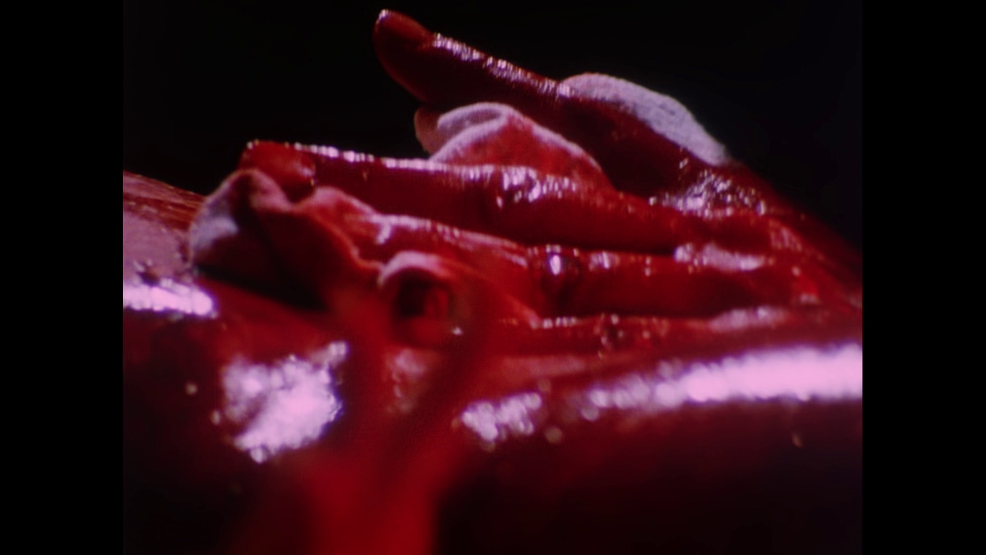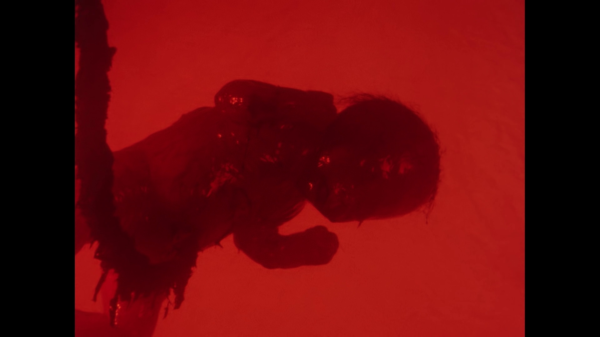 The opening urges viewers to reject the left, "rational" side of the human brain and instead indulge in a world of free association, bestial instinct, and irrational hallucination. To back this up, viewers are treated to "Ovarian Eyeball," a quick, gruesome study about the primitive nature of childbirth. The first full segment, "Human Larvae," establishes an unhealthy relationship