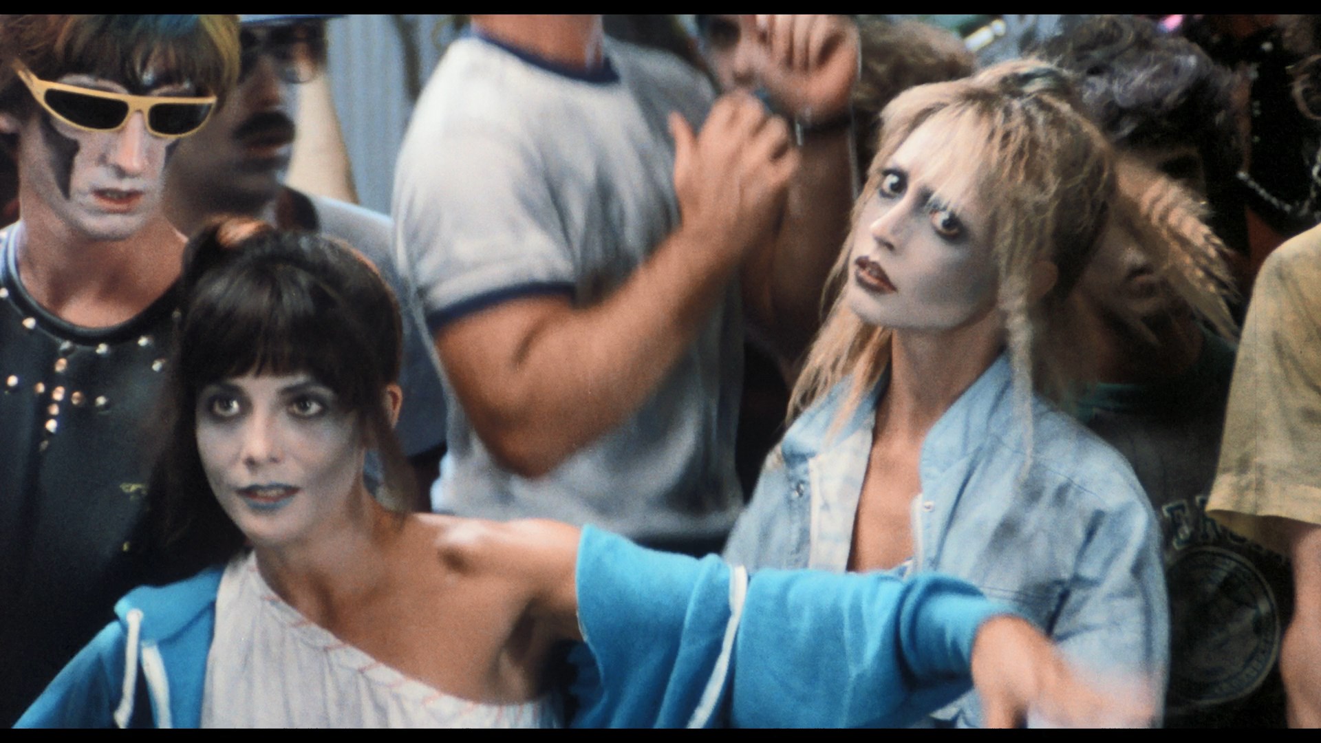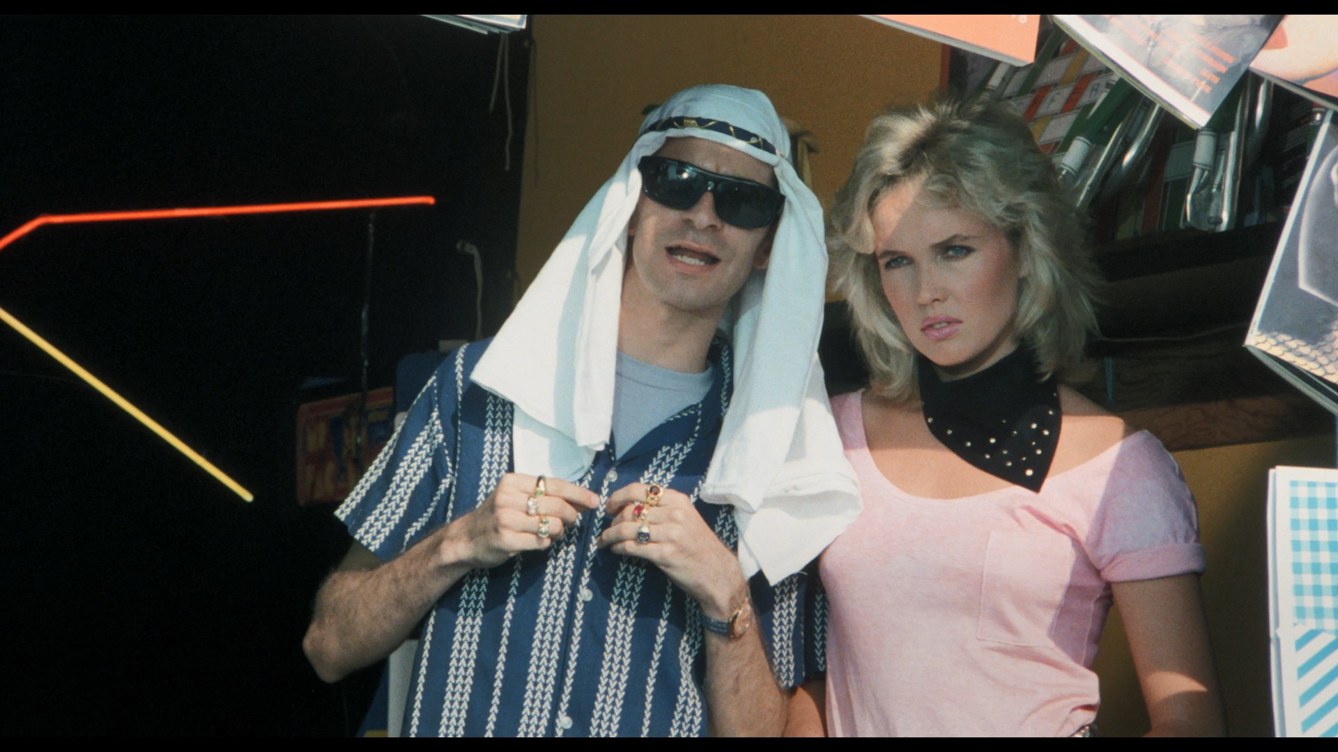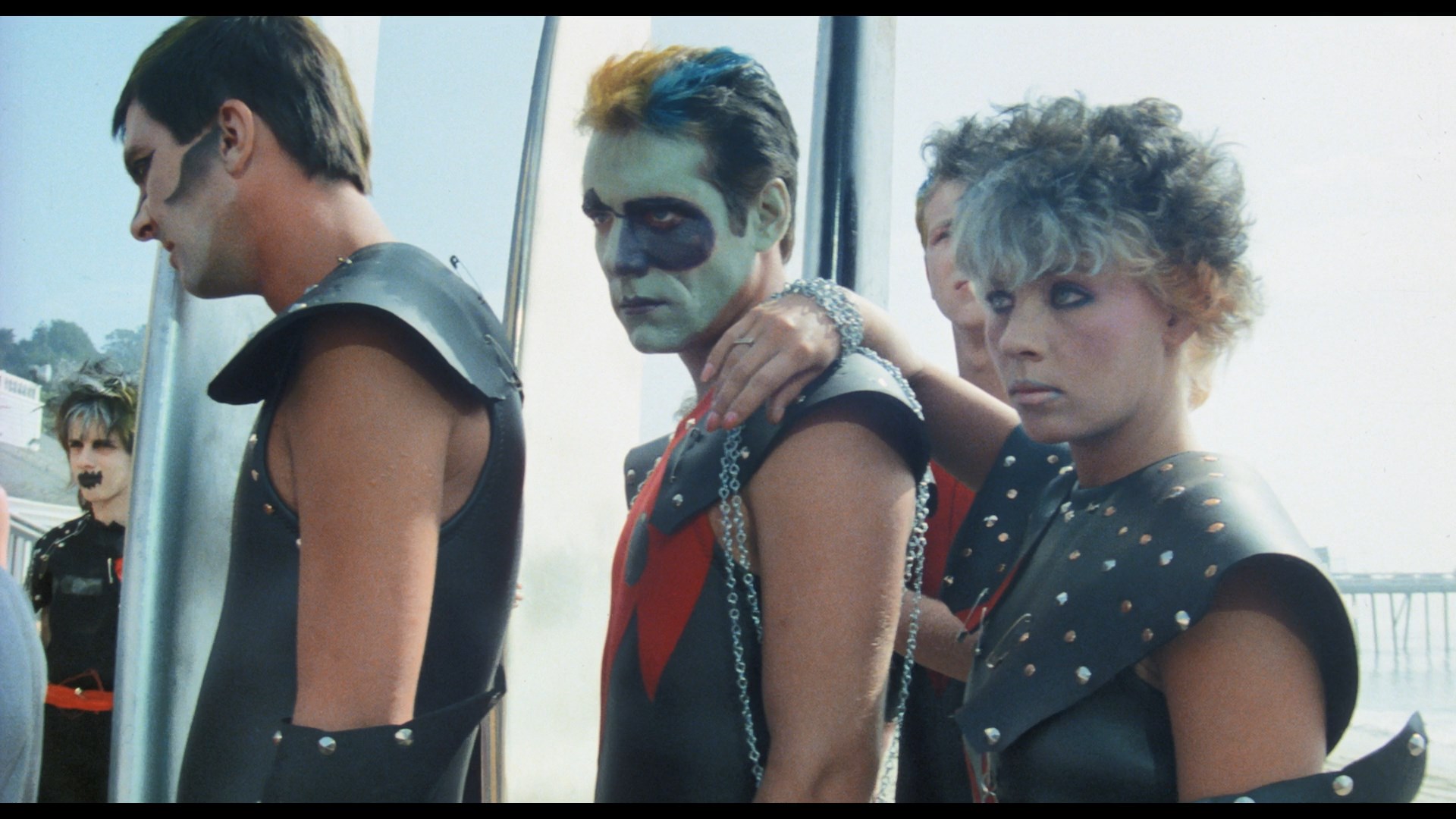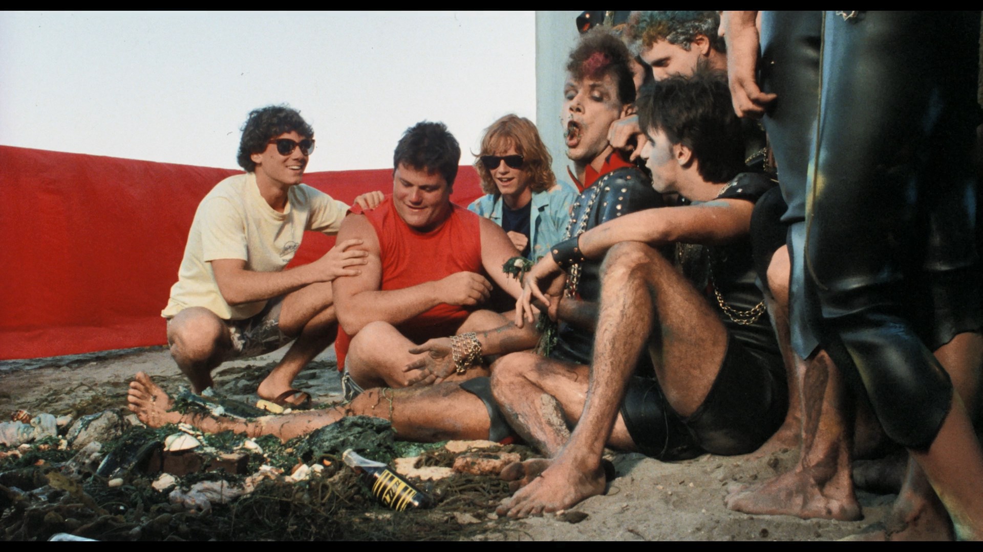 The theatrical cut on disc two has no video extras but does come with two audio commentaries, the first with a different Badat track essentially picking up where the last one left off and going into the film's editing process, more about the casting, the footage added to this version, the theatrical and video releases, the public's reception, and more. Then you get an audio commentary by Zack Carlson and Bryan Connolly, authors of Destroy All Movies! The Complete Guide to Punks on Film, who enthusiastically compare this right off the bat to Get Crazy and Suburbia before embarking on a very funny and well-informed pop culture breakdown of the whole film. (Don't miss the John Stamos story!) Both of them are also represented in the insert booklet courtesy of an excerpt from their book and text Q&As with Badat and Deezen, followed by an archival review by Joe Bob Briggs. However, this release wouldn't be complete with some representation for the late Mike McPadden, one of this film's most enthusiastic champions, who wrote an impassioned essay about it in his essential book, Teen Movie Hell: A Crucible of Coming-of-Age Comedies from Animal House to Zapped! His full appraisal is included here and well worth reading, including his on-point admiration for a genuinely stunning in-camera "split screen" sequence (one of two in the film itself) that could justifiably be taught today in film schools. Really.