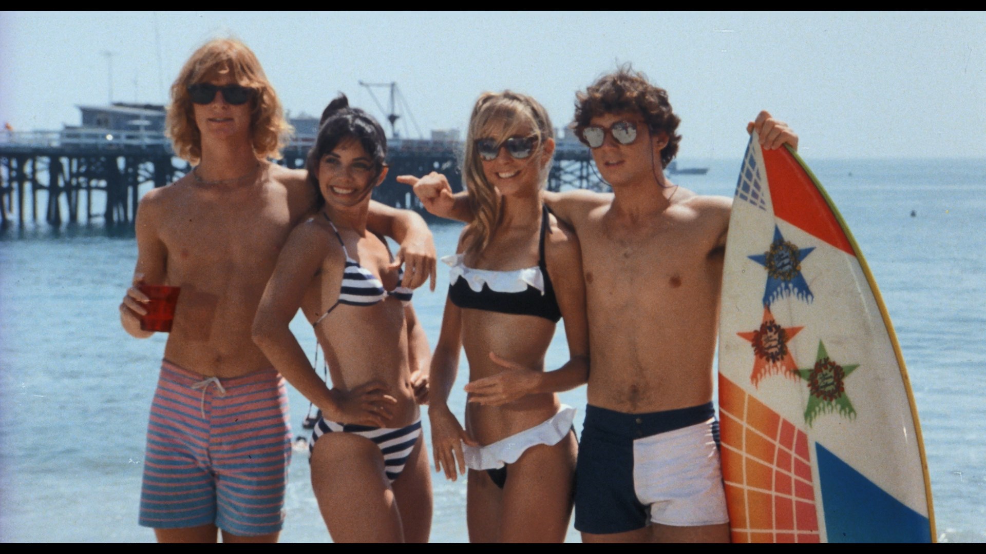 Disc one features an audio commentary with Badat and Vinegar Syndrome's Brad Henderson, which dives into the differences between the two versions, the inspiration for the script (written in two days and inspired by massive pollution contamination around Venice Beach), the good working relationship with the actors, his own surfing experiences, and lots more. You also get a solo track with a very energetic and horny Deezen (conversing with someone we can't Surf IIhear) who fires out stream-of-consciousness memories about the shoot and cast while gushing about the cinematography, recalling Stoltz's fondness for greasy pizza, railing against PMAS ("Perfunctory Male Ass Shots") in cinema, his Surf IIrefusal to go along with his character's original name ("Stinky"), and his joy at being told not to tone it down on this film, the only one where he got top billing. The very in-depth documentary "The Stupidest Movie Ever Made: Drinking the Drink of Surf II" (65m48s) brings together Badat, producer George Braunstein, assistant director Scott Easton, composer Peter Bernstein, costume designer (and self-described "comedy maven") Carin Berger, casting director Fern Champion, and actors Deezen, Kerridge, Camden, and Peter Isacksen. Pretty much everyone gets to tell their story here about how they came to the project and seems to have a real soft spot for it, charting its history from the original, much darker script (Surf Death) and the grisly accident that inspired it through the whole casting process that brought together a crew of actors you can't believe all inhabited the same space for days on end. Also on the first disc are a behind-the-scenes gallery (1m14s) set to "Talk Talk" and a VHS-sourced sizzle reel video (21m26s) used to pitch the film.
