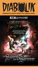 sword and sorcery craze that sprang from the 1981 pair of Excalibur and Dragonslayer and reached perfection the following year with Conan the Barbarian. All you really needed was an austere setting with lots of dark interiors, some flashy magic lighting effects, some swords, a mixture of beefy heroes and scantily-clad women, and presto. One of the quickest cash-ins was The Sword and the Sorcerer, a very profitable indie whose striking poster art and naughty trailer made it a hot ticket in the Spring of '82 during some very crowded competition. It was also the biggest hit for prolific action director Albert Pyun, who soon dove into Cannon Films with Cyborg, Dangerously Close, and Alien from L.A. Despite its lack of availability on home video for several long durations, Sword has remained one of his most popular films while its robust score by composer and pop arranger David Whitaker (Vampire Circus, Scream and Scream Again) became a fast fan favorite.
