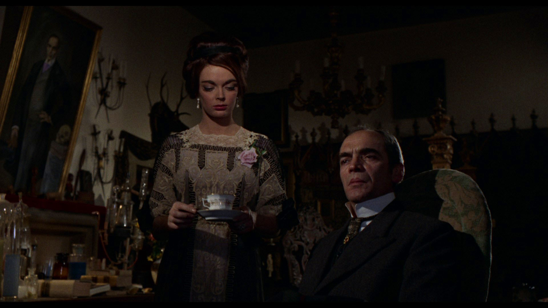 Released theatrically in the U.S. in 1965 by Manga Pictures, The Ghost was shot primarily in English with its principals dubbed in post-production; as usual for this run of films, Steele's real voice is nowhere to be found. The film was uncut, but annoyingly the American distributor moved the pre-credit seance scene after the main titles which, as with a similar move on Plague of the Zombies, destroyed continuity and made the opening incomprehensible. The film was largely ignored after that until genre publications rediscovered the Italian Gothic film wave in the 1980s, with a VHS from Sinister Cinema from a nice 35mm print earning it a new generation of fans. The first retail DVD of the film came in 2004 from Retromedia (who presumed the film was public domain, which it isn't), flat letterboxed at 1.66:1 and running 94m57s paired up with the English dub of another Magna import, Dead Eyes of London. The transfer looked extremely weak, but at least this version moved the pre-credit sequence back where it belonged. Other bargain PD DVDs popped up on occasion including a really awful one from Alpha Video. Clocking in at PAL speed at 90m49s, the 2010 French DVD from Artus (as Le spectre du Professeur