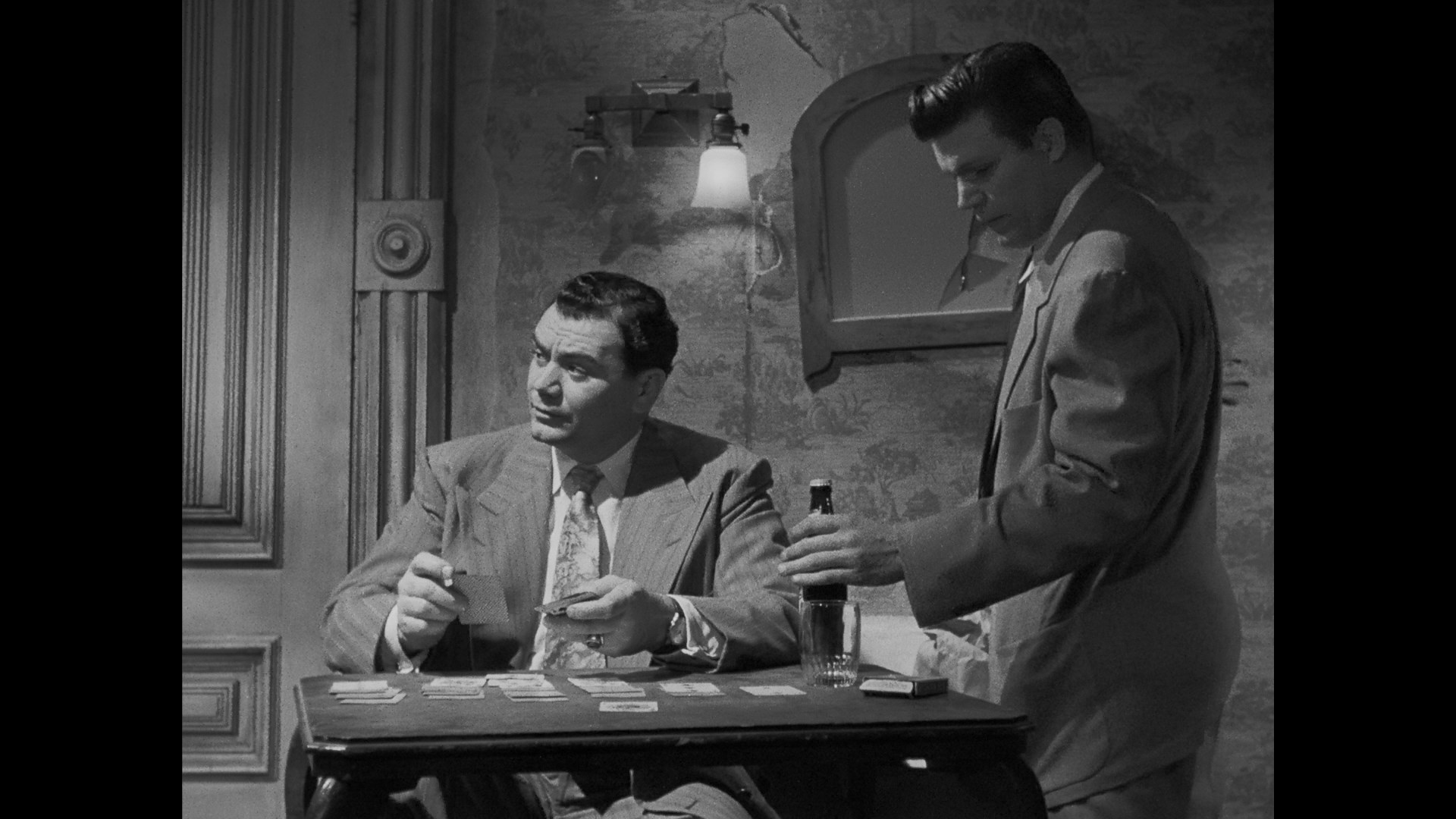 The storyline here isn't really the selling point, as The Mob is mainly an exercise in moody style with an amazing rogue's gallery of ultra-manly character actors: Richard Kiley, Neville Brand (Eaten Alive), Ernest Borgnine, John Marley, and even a bit role for Charles Bronson. You can practically smell the stale cigarette smoke and whiskey wafting off the screen, while composer George Duning (Picnic) supplies just the right dose of swanky musical polish. First