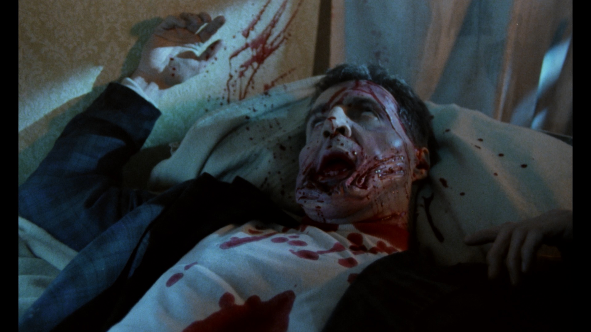 Barely shown theatrically in the U.K., this film went straight to VHS in the U.S. via Academy Entertainment (complete with striking but misleading artwork aping the look of Darkman) in an unrated version as well as a far scarcer R-rated variant that toned down some of the gore and omitted some frontal male nudity during the first kill scene. After that it became impossible to find this via any legitimate means at all until the 2019 Blu-ray and VHS dual-format edition from Vinegar Syndrome, which follows their usual peerless track record by refurbishing a title few would have expected to see in pristine shape. The new transfer, a 2K scan from the 35mm internegative, is a massive leap over the old VHS, obviously, and keeps the original grainy aesthetic of the film intact while featuring satisfying detail levels and sometimes striking primary color schemes. The DTS-HD MA English mono audio track is extremely basic and flat, but that's the nature of the original recording; optional English SDH subtitles are provided. Two audio commentaries are also provided, the first featuring director Anders Palm with film journalist David Flint; then you get producer Mark Cutforth in conversation with Peter Kuplowsky and Justin Decloux of Laser Blast Film Society. Both are chock full of info and cover everything you could want to know about the fundraising process, the impact of Friday the 13th on the production, the special effects connection to Hellraiser, the lack of genre respect in the U.K. at the time, the influence of Udo Kier's Blood for Dracula performance, the casting process, the horror-comedy balance, the tiny size of the crew, and plenty more. The original, very spoiler-heavy trailer is also included (under the Hand of Death title, just like the main feature here) along with a gallery (2m44s) of fun production photos and other ephemera from Cutforth's collection, including a random shot of Kier for good measure. The title is also available as a limited 2,000-unit slipcover edition designed by Earl Kellser Jr.