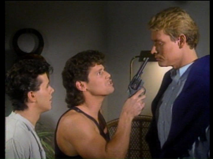 Three leather-clad hooligans -- Turk (Malis), ultra-permed girlfriend B.B. (Hartwell), and Wimp (Capellupo) -- decide to get their kicks by holding up the owner of a record store (a great opening scene for vinyl heads) and dancing in the aisles. While Turk and B.B. are pilfering the back room for cash and firearms, Wimp warns them that a pair of squeaky-clean yuppies wandered into the store. However, their facade turns out to be a little misleading as Ginger (Kates) sneaks some merchandise into her stockings while Danny (Harris) keeps watch. Turk uses Ginger's sticky fingers as leverage to get an invite to the party they're heading to at the home of Rod (Glover) and Arlene (West), who spend their spare time tended to exotic plants. Of course the party soon turns into alternating sessions of psychological abuse (including a champange-soaked game of Russian roulette) and sex around the hot tub and swimming pool before the twist ending arrives, which shouldn't be too surprising if you've seen that aforementioned Deodato film.