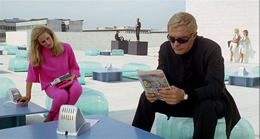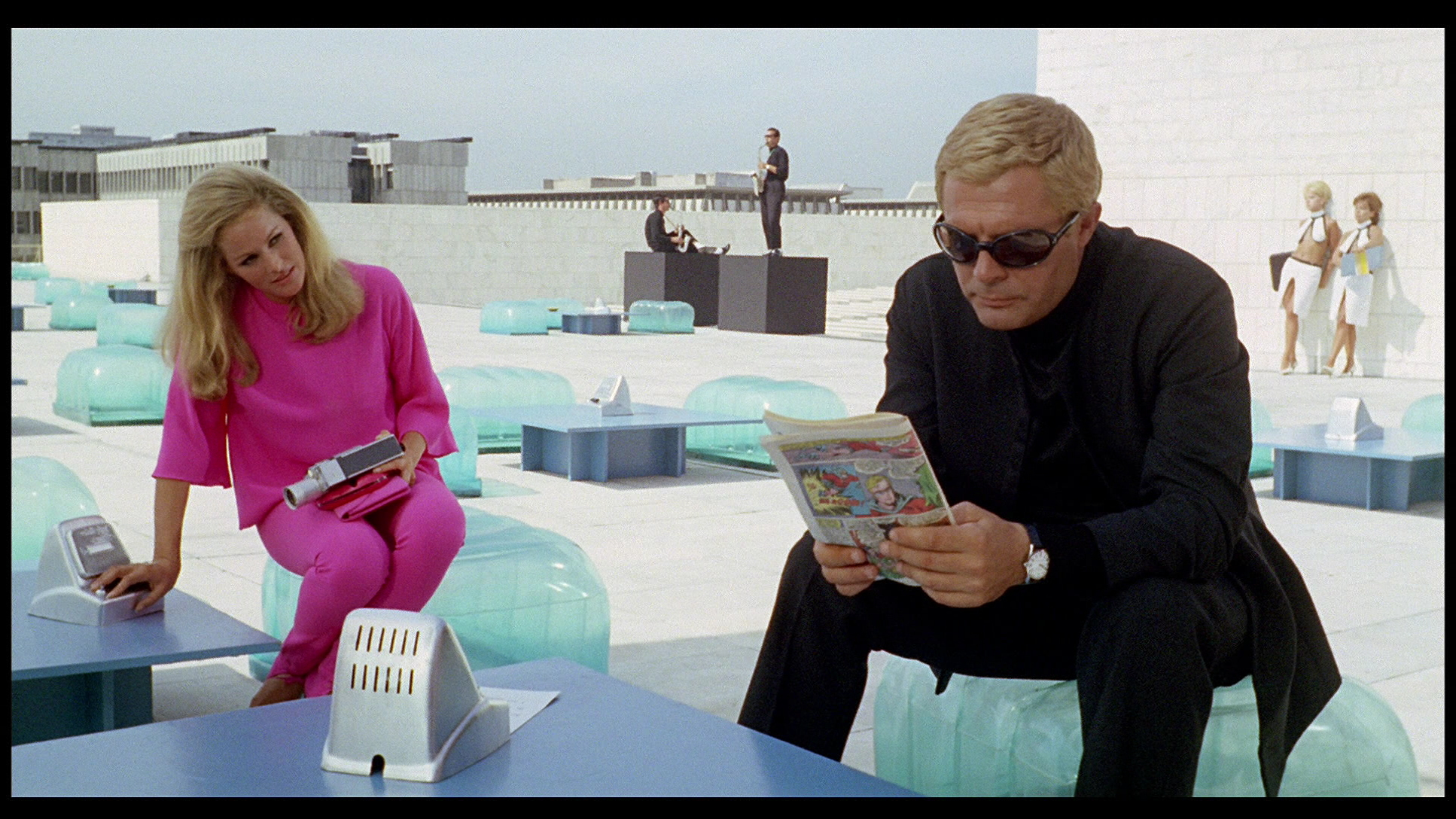 A decade later, Blue Underground revisited the title for a Blu-Ray release with markedly improved results. Colors are considerably stronger and closer to the pop art sensibilities of the period (check out Andress' outfits and the often blindingly yellow lighting, for one), and the entire image is much more lively and filmic than before. On the other hand, in some shots there's some light, odd grain that doesn't look completely filmic and can wreak havoc with background textures and the not terribly crisp level of detail (check out the second frame grab), but in general it's a pleasing and punchy transfer that's a hefty step up from its now-antiquated SD counterpart. As with the DVD, both the English and Italian soundtracks are included in DTS-HD mono with optional English subtitles (both an SDH version for the English dub and a different translation for the Italian track), as well as subtitles in French and Spanish. In addition to the American trailer, the disc also includes the much better-looking Italian trailer, a poster and still gallery for the film and for star Mastroianni, and best of all, the feature-length Marcello: A Sweet Life, a feature-length 2006 documentary by Mario Canale and Annarosa Morri that covers the beloved actor's life in fascinating detail; expect to hear lots about Sophia Loren and Federico Fellini, obviously, but there are lots of nice little obscure stories in here, too including archival interviews with the man himself along with Claudia Cardinale, Anouk Aimee, Ettore Scola, and many more.