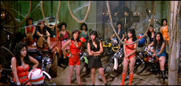victimized, and kicking butt again; or, to paraphrase the immortal Joe Bob Briggs, there ain't much plot to get in the way of the story. The fast-paced fun begins with a female biker gang (looking like they escaped from the nearest Cannon Film) gunning into the gambling den fortress of drug lord Mr. Tiger, with whom two of the lovely ladies have a particularly personal axe to grind. When their seige goes south, the damsels wind up held captive in his underground lair where they're mistreated in classic women-in-prison fashion by a sadistic warden, who likes torturing them with small furry critters. Of course, it all turns out to be a front for a much larger, James Bondian scheme being hatched by Mr. Tiger to infect the world with a ruthless sex drug, so the tough ladies must find a way to escape before they become his first test subjects.