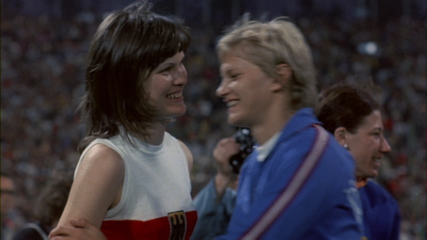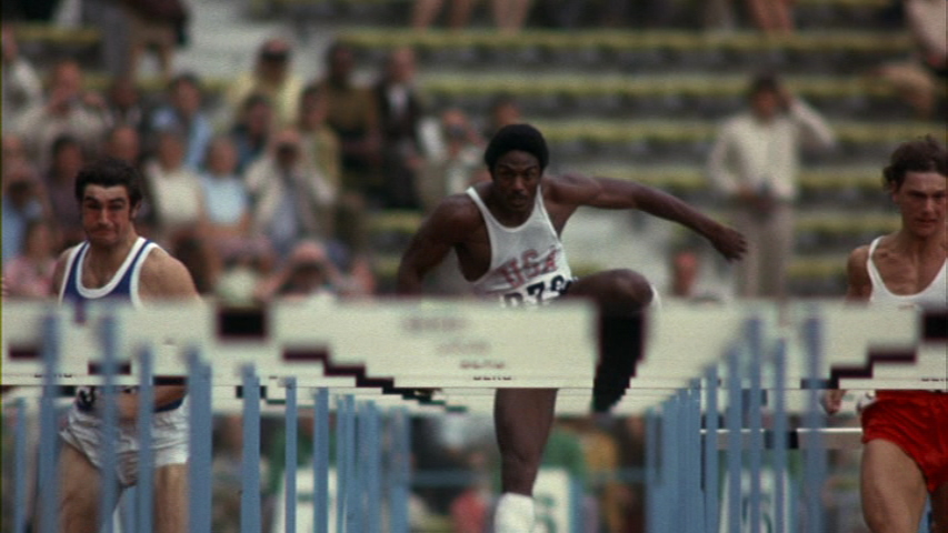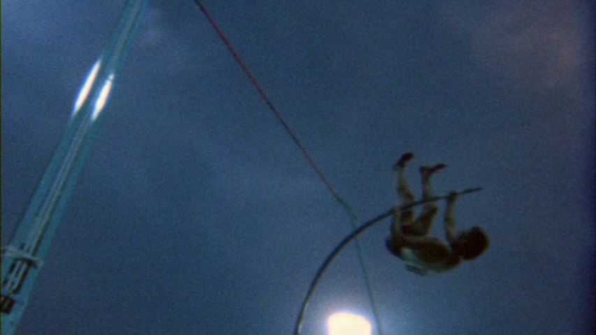 Juri Ozerov (Stalingrad) kicks the film off with "The Beginning," a 10-minute impressionistic overview of preparations for the games including athlete arrivals, training, and a rapid-fire montage of moments to come. From there it's a diverse whirlwind of perspectives: Mai Zetterling (who made the switch to directing after a successful acting career) takes a look at bodybuilders including a hilarious look at the massive quantities of protein needed to sustain them in "The Strongest;" while Arthur Penn (Bonnie & Clyde) gets downright hallucinatory with "The Highest," a dreamlike, slow-motion study of pole vaulting (including some nifty reverse shots and a few painful blunders). Michael Pfleghar turns his camera to the female contestants (some with huge afros!) including a gorgeous gymnastics passage in "The Women," while Ichikawa also uses slow motion and handheld POV shots to capture the 100-meter dash in "The Fastest."