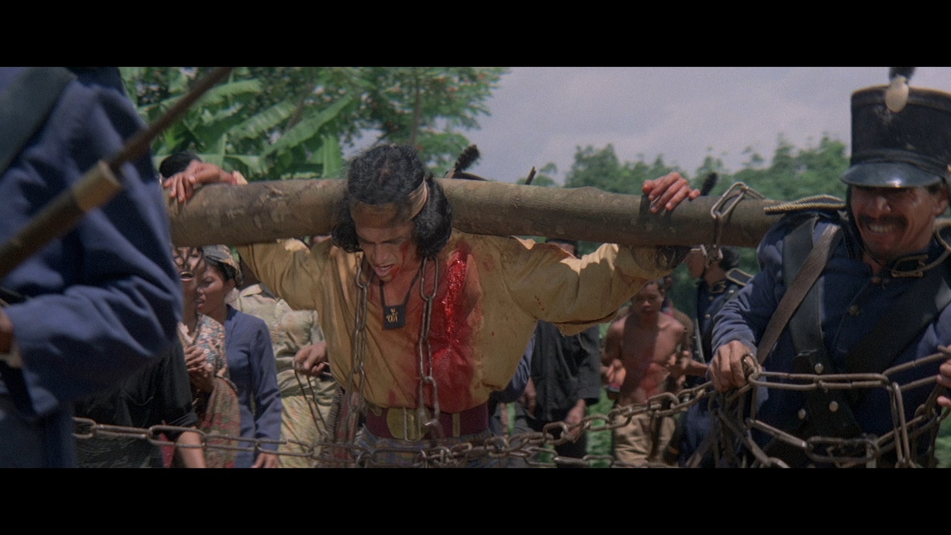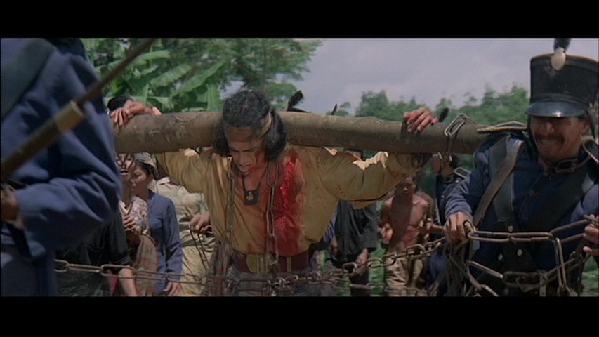 as well as the staggering The Devil's Sword. Here he teams up with his one-time wife, Eva Arnaz (right after the still underseen wacko gem, Special Silencers), for a rousing adaptation of an Indonesian comic about Jaka Sembung, a freedom fighter living in 19th century Indonesia under Dutch colonial oppression. We first see our hero in a dirty labor camp where he leads his fellow prisoners in a small-scale uprising. Their keepers don't take kindly to this disobedience and quickly audition thugs to take out Jaka. The chosen one, big bald brute Kobar (played by Satan's Slave's S. Parya), tracks down his prey for a showdown in the middle of a field but proves to be no match, leaving the Dutch baddies to call on an undead, rabbit-toothed black magician (Mystics in Bali's Mochtar) to trap this troublesome pest. (The scene in which the magician is revived by hand-controlled bottle rockets which blow his coffin out of the ground is unlike anything else you've ever seen.) Soon Jaka's fallen into the clutches of his enemies and chained to a wall with his eyes gouged out, but even that can't stop our hero from staging a truly unique comeback with the aid of another wizard and lots of hard, fast-flying kicks