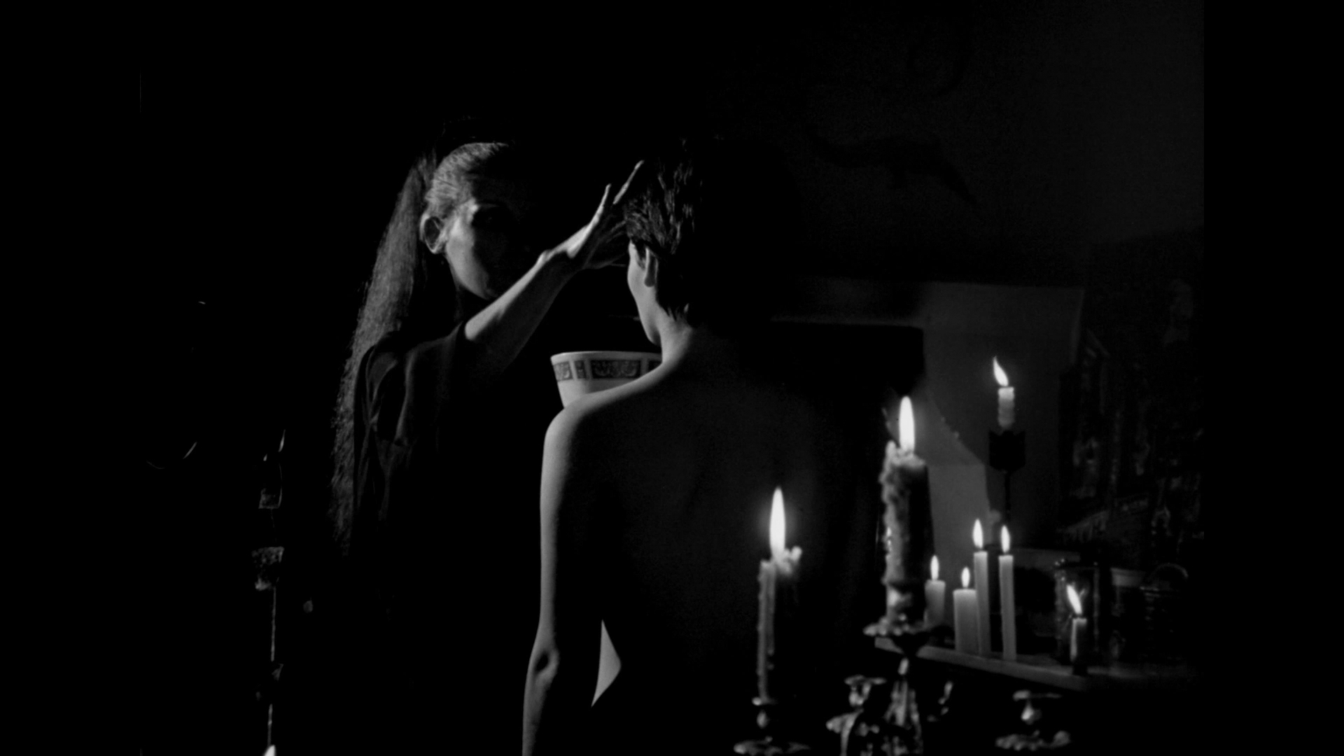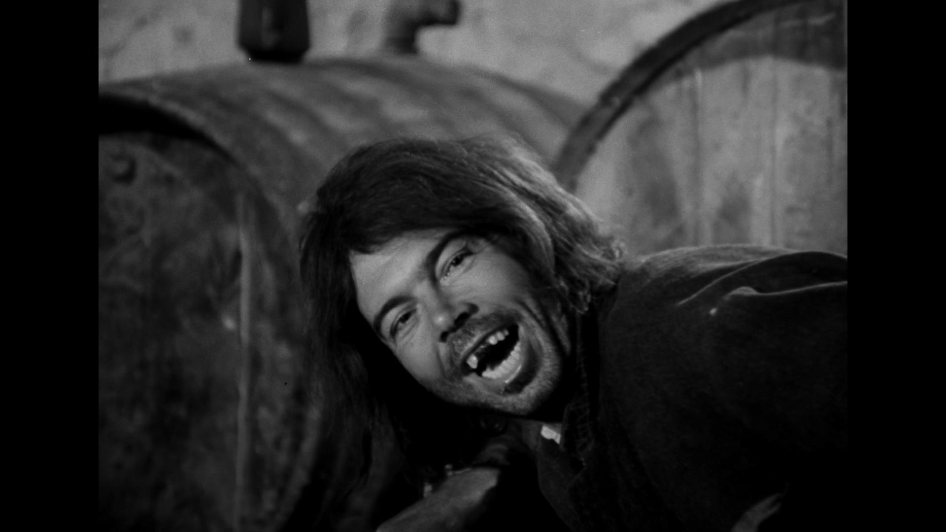 Also included on the disc is a second (or technically third) feature, The Deserter, a Greek-Italian co-production about a young man, Alexis (Politis), who's so distraught by the traumas of combat that he goes on the run into the woods. After smashing his gun to bits against a tree and tearing into his uniform, he strips down for a swim only for a passing mute farm girl, Lisa (Kyriakaki), to playfully steal his clothes. They share a moment of near passion before she bolts off, so he heads to the closest farm where sexually frustrated Ermina (Parisi) offers him shelter in their barn. When she isn't dealing with her piggy, money-obsessed husband, Yiannis (Stratigos), Ermina grows carnally close to the new arrival, who also starts sleeping with the farm girl, who turns out to be Ermina's cousin. When soldiers arrive looking for the deserter, his near drowning while hiding in a barrel pits the two women against each other in an escalating seduction contest that involves erotic grape munching, mud wrestling, a nude bloodletting consultation with the local love witch (Dali again), and a feverish climax you won't believe.