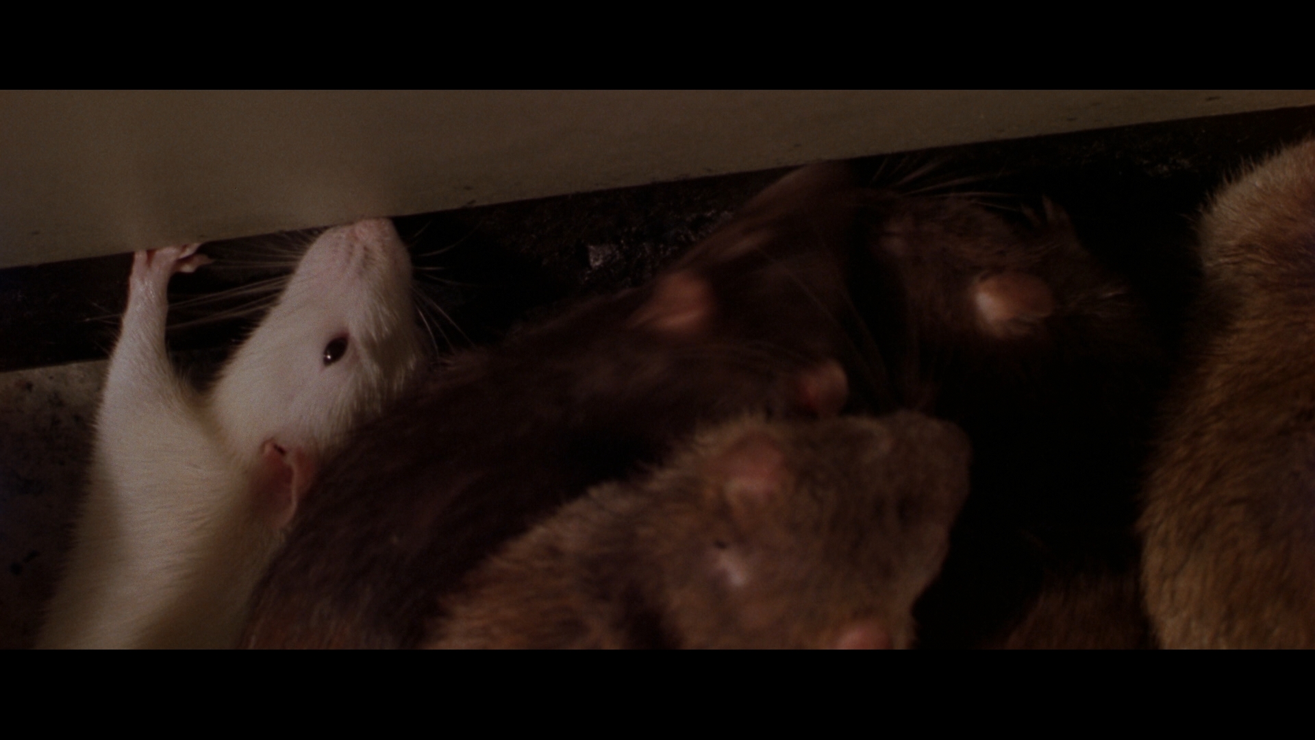 Among the preexisting video extras here, the big champ here is easily the excellent "The Year of the Rat" (73m13s), a fly on the wall documentary by Julie Ng chronicling her year-long journey to Vancouver where she captured everything from pre-production to the film's release over one memorable year. It's a very fast moving and engaging look at the filmmaking process and still holds up extremely well. Narrated by Davison, "Rat People: Friends Or Foes? – A Real Rat Documentary" (18m41s) is a quirky look at the role of rats in modern society as pets and sources of fear, while an amazing music video for Glover's rendition of "Ben" (heard over the film's closing credits and a cover of the hit Oscar-nominated song performed by Michael Jackson in the sequel to the original Willard) is a David Lynchian fever dream you have to see to believe. (A very rapid-fire Glover commentary is also included.) A hefty batch of deleted and alternate scenes (25m57s) with a patchy optional commentary (that seems to be missing the first 90 seconds or so) is a great showcase for some of the material that had be altered to get that PG-13, mainly one memorable death sequence that plays better here, and the original, more faithful ending that was changed after test screenings. (It was also supposed to close with Pearl Jam's "Rats," which was wisely scrapped somewhere along the line.) A batch of raw behind-the-scenes footage and interviews conducted for the film's press kit (29m45s) is a good sampling of bite-sized tidbits from the set, and you also get a batch of TV spots (3m46s) and the very, very 2003 theatrical trailer (jarringly scored to Smashing Pumpkins and touting "America Online Keyword: Willard") in full frame SD providing a peek at how the unmasked Super 35 framing looks. On to the new stuff, "The Road to Willard" (79m48s) is a sprawling, career-spanning interview with Morgan from his start with the excellent The Boys Next Door on through his watershed TV work, his move to features, and the difficulty transitioning back due to major changes in the interim. He's very funny and candid including some funny turns of phrase about his encounters with various executives, especially the segment at DreamWorks. He also chats a bit about some prospective casting choices to star in this film like Jack Black, Jason Schwartzman, Mark Ruffalo, Macaulay Culkin, and Joaquin Phoenix, all of which are fascinating to contemplate. Then McLachlan gets his turn in "Destination Willard" (45m53s), also charing his career course from a fervent cyclist to an ace cameraman with stops along the way including stints on shows like MacGyver, his more recent gig with Game of Thrones, and his time with the X-Files crowd including Millennium. Finally, "The Rat Trainer's Notebook" (11m18s) compiles some very colorful rat training footage from Boone's Animals of Hollywood showing the furry little thespians hard at work running all over wooden sets and dummies.