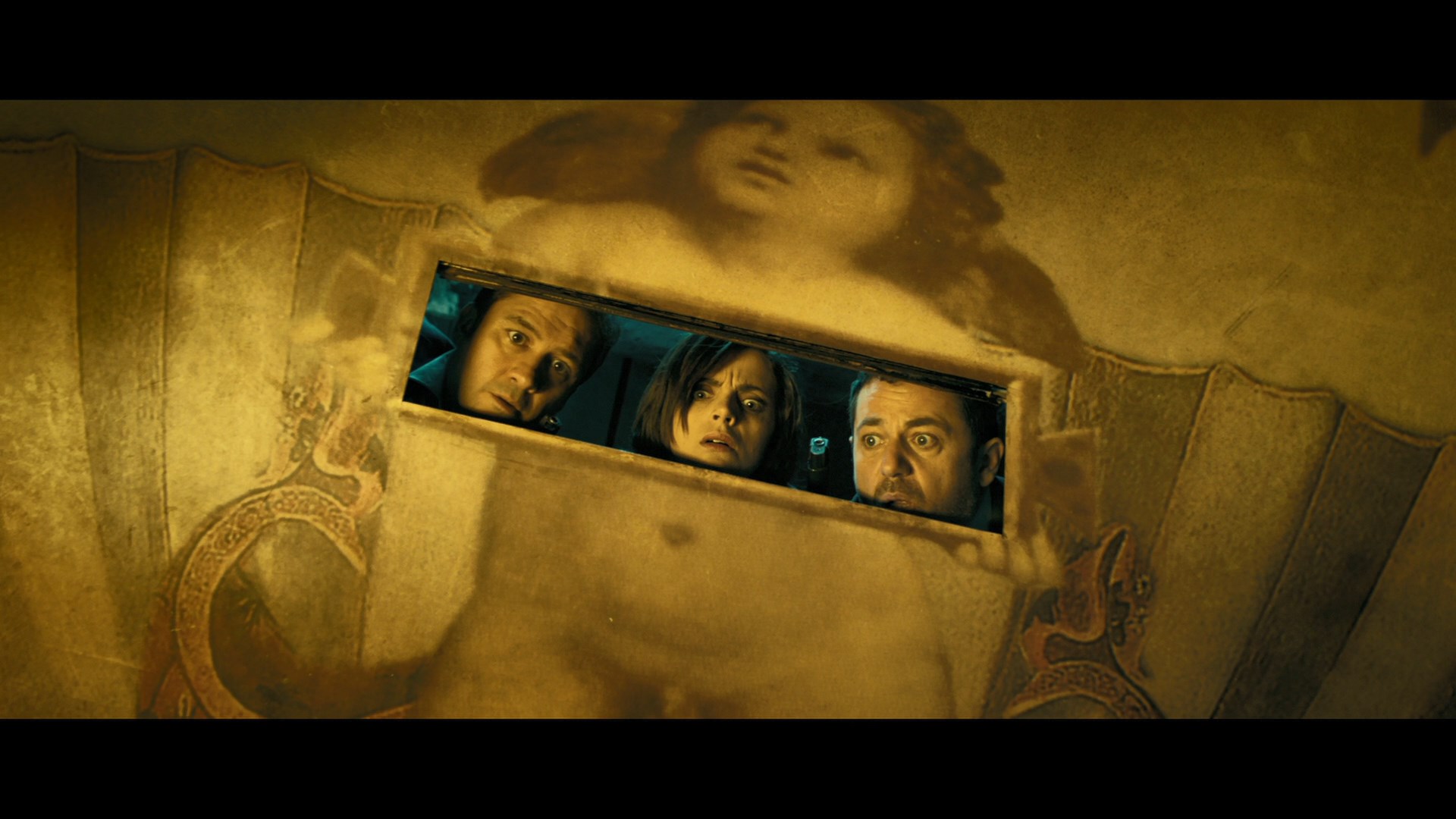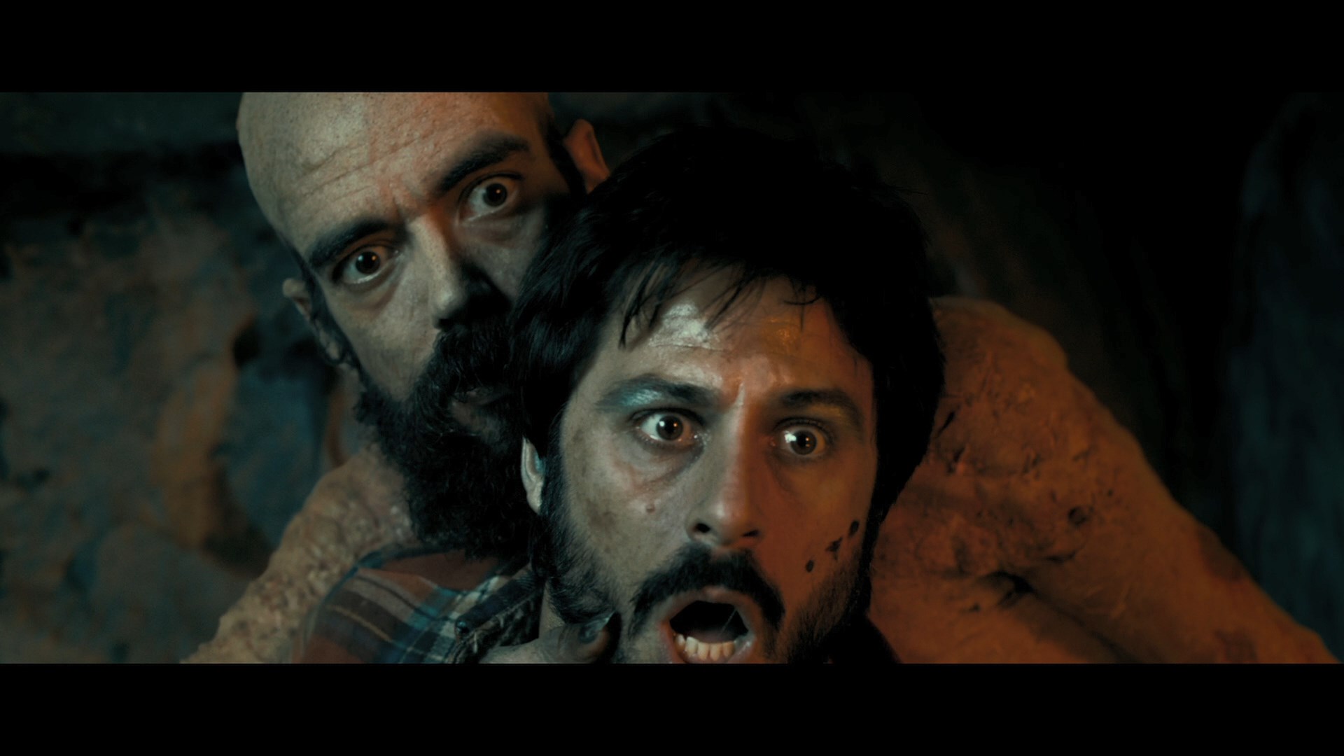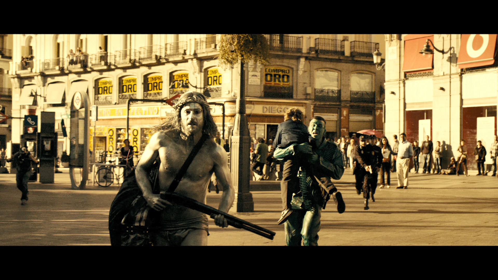 which is good news as that was already a solid presentation that preserved the film's stylized and sometimes extreme color schemes with an emphasis on gold throughout. Audio is presented in Spanish DTS-HD MA 5.1 and PCM 2.0 stereo options; stick with the former as it's way more dynamic and has lots of fun channel separation, with optional English, English SDH, and Spanish subtitles included. Though it isn't designated on the packaging, the disc also features three promotional featurettes: "The Story" (2m44), essentially an EPK-style collage of production footage and an interview with the director; "The Characters" (4m6s) featuring de la Iglesia chatting about his conception of the protagonist and the conflict he finds himself in, again with some behind-the-scenes footage; and "Heist in Puera del Sol" (2m59s), covering the filming of the insane opening robbery scene. The subtitled IFC trailer is also included.